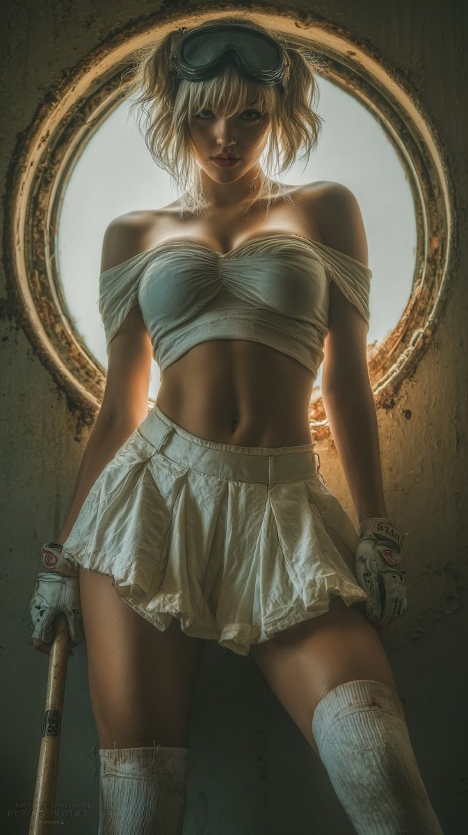 Мощный образ дерзкой юной женщины, воплощающей бунтарский дух и футуристическую эстетику. Ее распущенные белоснежные волосы контрастируют с массивными черными металлическими очками, создавая ощущение загадочности и силы. Свободный серый свитер через одно плечо подчеркивает ее хрупкость, в то время как обтягиющие белые чулки выше колена добавляют нотку дерзости и игривости. В руках она сжимает бейсбольную биту – символ готовности к борьбе и защите своего пространства. Действие разворачивается на фоне зловещего индустриального пейзажа, где округлые окна словно глаза смотрят в пустоту. Темный дымчатый фон создает атмосферу таинственности и опасности, усиливая ощущение отчужденности и одиночества главной героини. Вся композиция пронизана духом будущего – сочетанием технологичности, бунтарства и загадочной женской силы. Это не просто портрет, это визуальная история о девушке, которая живет в мире перемен и готова к любым вызовам. Она излучает уверенность и решимость, словно готовая бросить вызов самой судьбе. Взгляд ее полон скрытого смысла, а поза говорит о готовности к действию. Это мощная и запоминающаяся работа, которая захватывает воображение и заставляет задуматься о будущем человечества. Она выглядит как героиня антиутопии, сильная и независимая, готовая сражаться за свои идеалы в мире, где технологии переплелись с мрачными индустриальными пейзажами