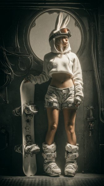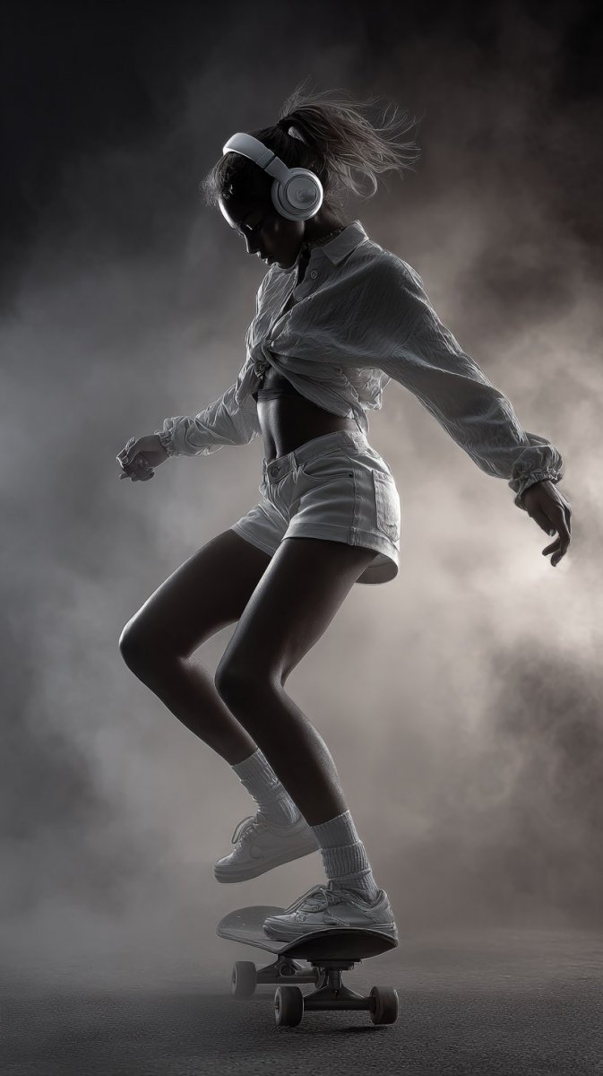 Запечатлён момент невероятной динамики и свободы – молодая женщина, парящая в воздухе на скейтборде. Её высокий конский хвост развевается, создавая ощущение стремительного движения, а белый свитер и чёрные шорты контрастируют с белыми кроссовками, подчеркивая спортивный стиль и энергию. Наушники, небрежно обернутые вокруг шеи, говорят о погружении в собственный мир музыки во время этого захватывающего трюка. Руки раскинуты в стороны, одна нога согнута – поза выражает концентрацию и контроль над ситуацией, несмотря на кажущуюся легкость полёта. Фон окутан густым туманом, создавая таинственную и мрачную атмосферу, добавляющую драматизма и загадочности изображению. Игра света и тени в условиях плохой видимости усиливает ощущение мимолётности момента и подчеркивает динамику происходящего. Снимки сделаны в стиле raw – без излишней обработки и ретуши, что придает им естественность и аутентичность, передавая необузданную энергию и страсть к скейтбордингу. Изображение вызывает ощущение волнения и предвкушения, словно зритель становится свидетелем уникального момента, застывшего во времени – кульминации мастерства и отваги спортсменки, балансирующей на грани возможного в окружении таинственной дымки. Это не просто фотография, а воплощение свободы, движения и бунтарского духа