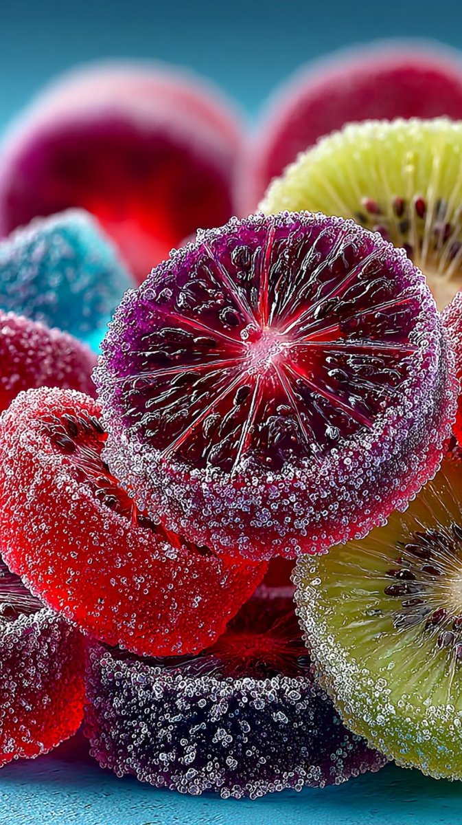 colorful gummy fruit candies with sliced lemon and kiwi in background, vibrant reds and blues blending with purple grape hues, vivid composition, hdr quality, hyper detailed textures, playful sweet candy wallpaper style --S 750 --style raw