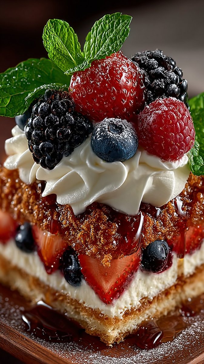 midjourney Изысканный десерт: торт со взбитыми сливками и свежими ягодами вблизи. Изображение из нейросети Midjourney
