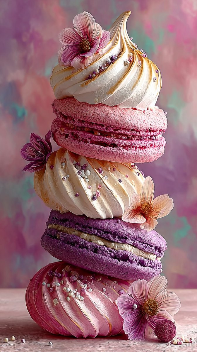 vibrant pink meringues stacked artfully against a swirling pastel bg, high contrast, soft textures, photorealistic, inviting lighting, colorful and dynamic composition, delicious and eye-catching --S 750 --style raw