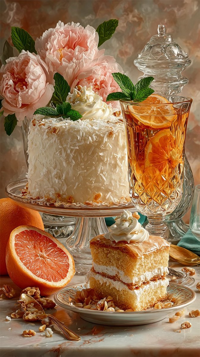 Сладкие соблазны: кокосовый торт, пахлава и апельсиновый тарт в нежной композиции - Пример работы нейросети Миджорни