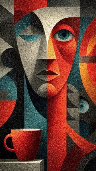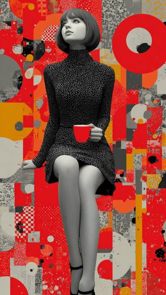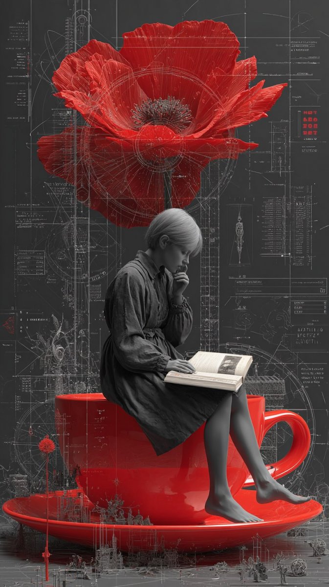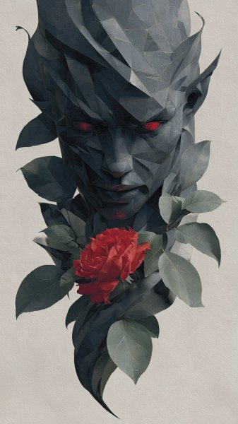 Мрачная и завораживающая сцена, где переплетаются образы вампира и алой розы, создавая ощущение потусторонней красоты. Его взгляд пронзителен благодаря неоновым глазам, а длинные ноги подчеркивают грацию и силу. Вся композиция пронизана геометрическими эмоциями, отражающими внутренний мир персонажа – сложный узор чувств и переживаний. Дополняет этот сюрреалистичный пейзаж матовая красная чашка, добавляющая элемент загадочности и намекая на скрытые желания. Все это разворачивается на монохромном фоне, усиливая контраст между светом и тенью, жизнью и смертью, реальностью и иллюзией. Работа представляет собой глубокое исследование двойственности бытия, где красота и тьма, страсть и отчаяние сливаются воедино в единое целое. Изображение обладает выразительной силой и заставляет задуматься о природе существования, о границах между мирами и о вечной борьбе противоположностей. Здесь сплетаются элементы готики, сюрреализма и современного искусства, создавая уникальное визуальное впечатление, которое останется в памяти надолго. Художественный стиль подчеркивает резкость линий и глубину теней, акцентируя внимание на деталях и усиливая эмоциональное воздействие произведения. Это не просто иллюстрация – это метафора, воплощение сложных философских концепций в визуальной форме