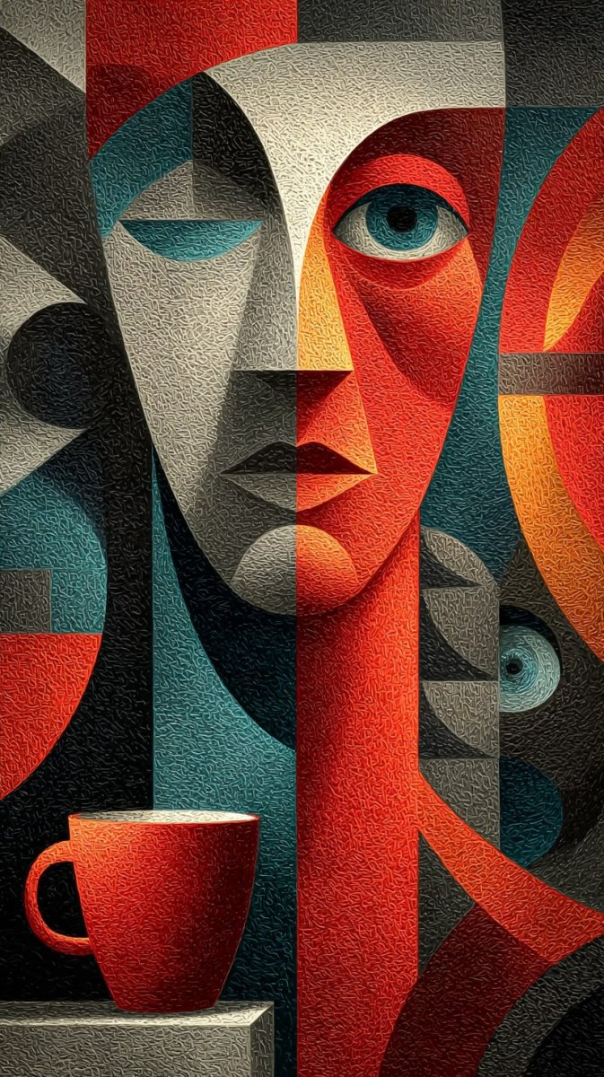 Яркие геометрические фигуры, словно осколки чувств, разбросаны по монохромному фону. Каждая форма – это отголосок эмоций, выраженных в сочном спектре красок, создавая визуальный калейдоскоп настроений и переживаний. На этом контрастном фоне выделяется матовая красная чашка, символ уюта и тепла в бушующем мире внутреннего хаоса. Блестящие губы намекают на желание говорить, выражать себя, но за этой внешней уверенностью скрывается сложность и неоднозначность. Вся композиция пронизана ощущением двойственности, отражением раздвоенной личности, тонким намеком на хрупкость психики и борьбу с внутренними демонами. Искусственный интеллект, создавший этот образ, запечатлел мимолетную вспышку безумия, словно сквозь призму абстракции проглядывает сущность шизофрении. Это не просто изображение, это визуальная метафора внутреннего мира, полного противоречий и скрытых смыслов. Картина вызывает вопросы о природе реальности, о границах нормы и патологии, о том, как сложно бывает сохранить целостность личности в мире, полном вызовов и испытаний. За яркими красками и четкими линиями скрывается глубокая трагедия человеческого существования, рассказанная языком абстрактного искусства. Это приглашение заглянуть внутрь себя и задуматься о хрупкости разума и силе духа
