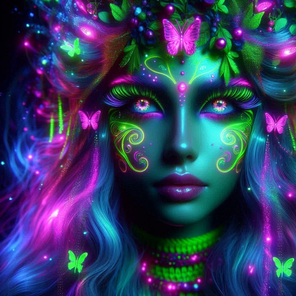a fantastical scene showcases a girl with acid green and electric magenta accents on her face, her striking eyes glittering under the dark setting. swirling patterns reminiscent of butterflies adorn her cheeks, complemented by vibrant accessories that sparkle in the light. a mystical aura surrounds her, accentuating the dreamlike quality of the imagery, cgi, 1024K