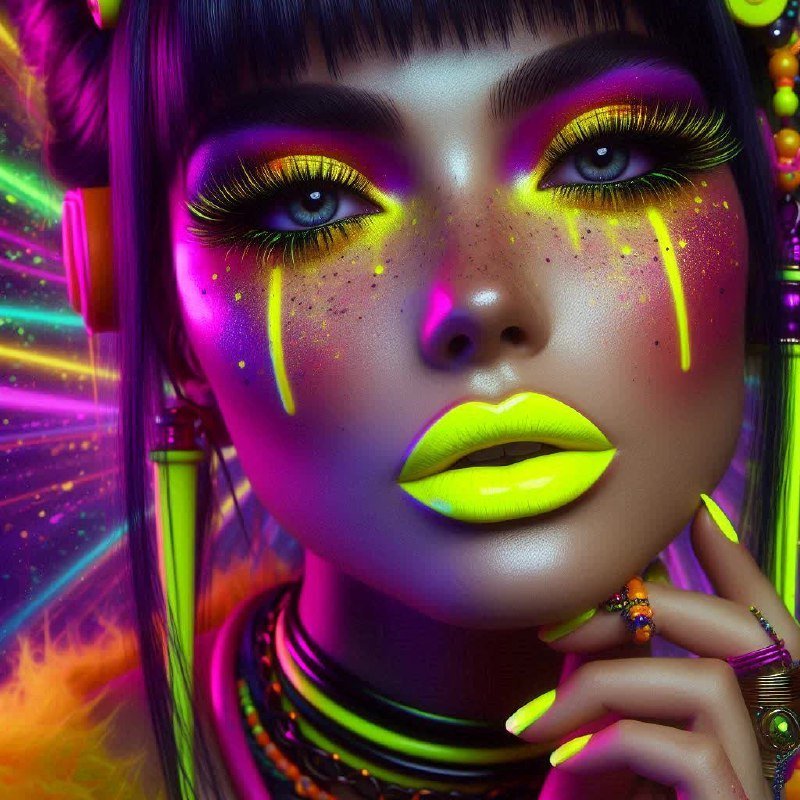 a striking scene features a girl with dramatic makeup in fluorescent yellow and vivid purple, her lips painted a stunning shade that drips with artistic flair. the bold eye makeup contrasts sharply with her dark complexion, while the colorful accessories reflect a whimsical and energetic vibe. the background bursts with colors, enhancing the surreal effect of her look, cgi, 1024K