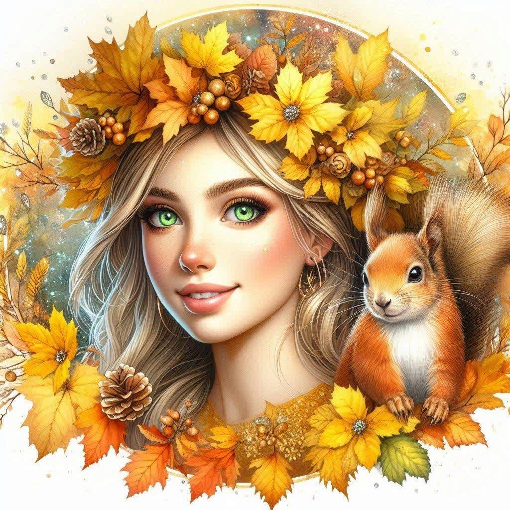 Акварельки, теплые осенние тона, портрет красивой девушки в венке из желтых листьев, с нежной улыбкой и зелеными глазами, рядом с ней ловкий белка, серебряные искры, четкая линия, динамика, нежность, голографический блеск, высокое качество, 5D, уютный осенний пейзаж.