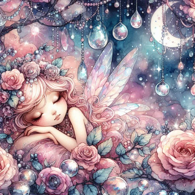 Водные краски, деликатные пастельные полупрозрачные тона розового кварца и серебра, изображение спящей феи, окутанной облаками из лепестков роз, хрустальные капли росы, отражающие лунный свет, жемчужные бусины, свисающие с веток деревьев, рисунок контура, высокое разрешение, динамика, нежность, мягкое мерцание звездной пыли, дуохромный голографический отлив, высокое качество, 5D, волшебный лес.