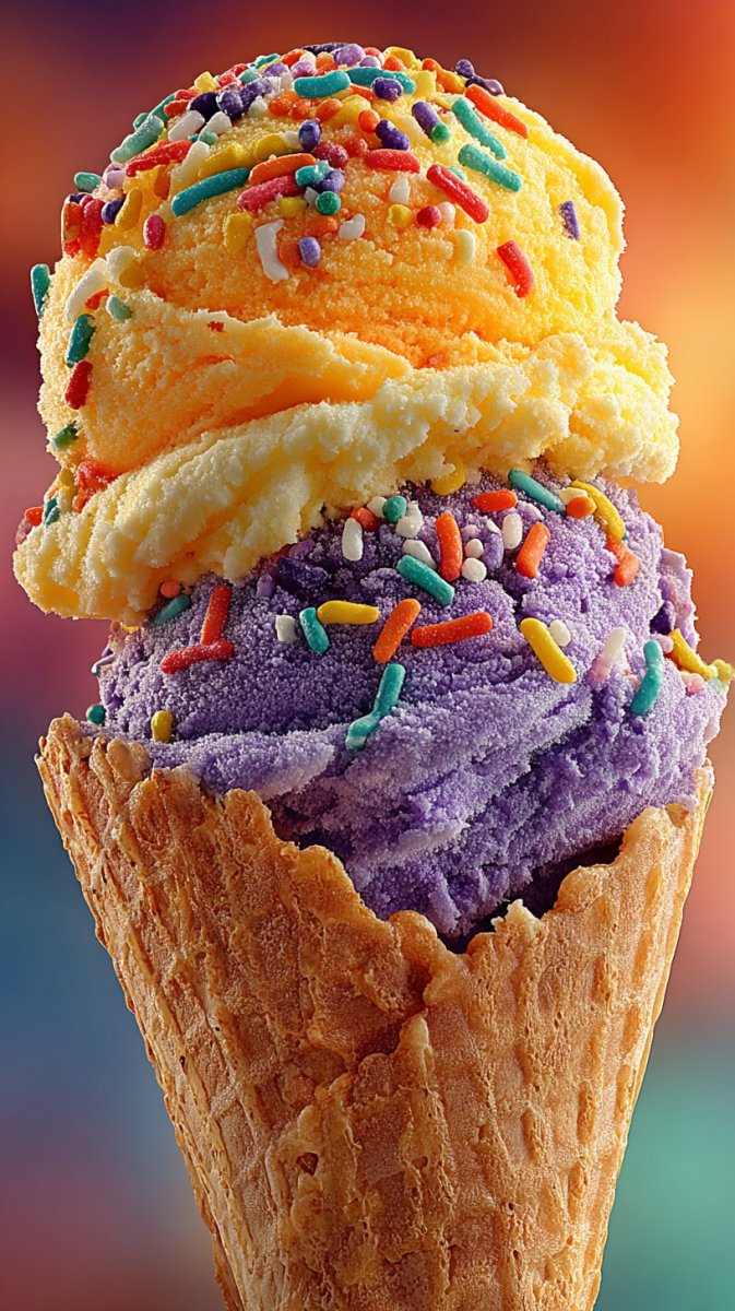 electric orange luminous purple ice cream cones topped with colorful sprinkles, dynamic positioning against a neon gradient background, vibrant visuals, mouth-watering appearance, HDR photography style, rich details --s 750 --style raw --w 10
