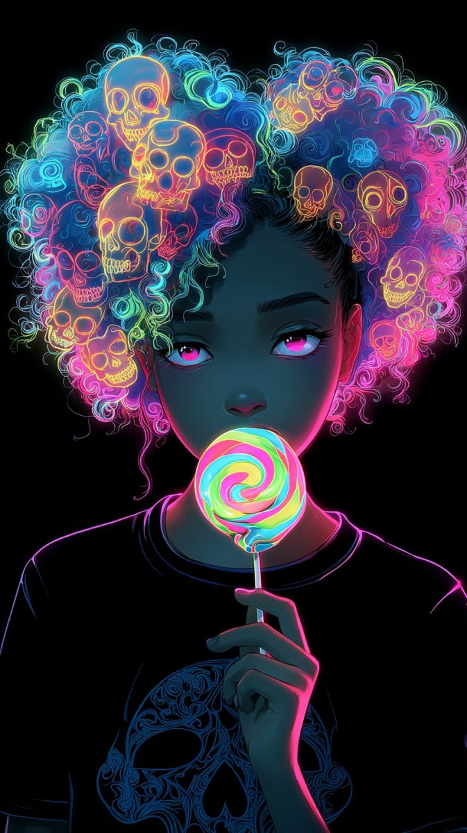 neon-colored skulls with rainbow hair wearing a black collared shirt and holding a colorful lollipop, vibrant pink and blue eyes, intricate digital art, black background