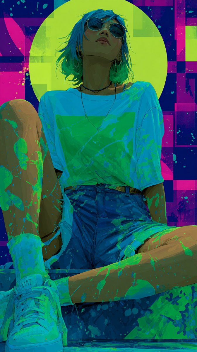 neon green electric blue spray paint art featuring a stylish girl with long legs, surrounded by abstract shapes and vivid colors, urban vibe, bold and trendy aesthetic, high detail, visual impact --s 750 --style raw --w 10