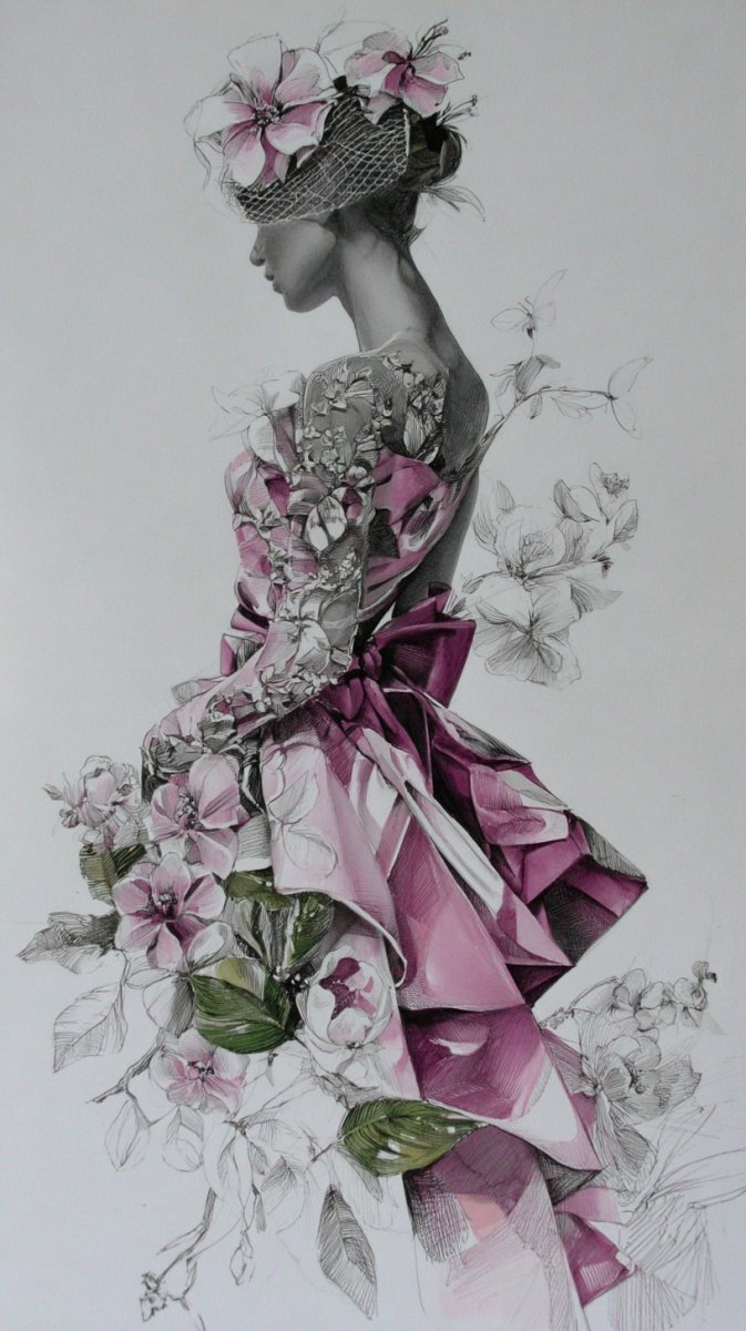Изысканная футуристическая мода оживает в этой завораживающей графической работе. Вблизи мы видим авангардный наряд, прорисованный с невероятной детализацией тушью и нежными пастельными оттенками, которые переплетаются с блеском металлических акцентов. Это создает ощущение волшебства, словно ткани сотканы из мечтаний. Модель застыла в грациозной позе на фоне сказочного сада, где деликатные цветы и шелковистые драпировки образуют гармоничный фон. Мягкий свет заката окутывает сцену, подчеркивая ее нежность и воздушность. Картина пронизана романтическим духом, вдохновленным эстетикой легендарного Christian Dior – воплощением изысканности и элегантности. Это торжество слияния природы и высокой моды, представленное в виде роскошных визуальных образов, способное покорить сердца ценителей прекрасного. Работа поражает тонкостью исполнения и создает неповторимую атмосферу утонченного стиля, где каждая деталь продумана до мелочей. Это не просто изображение одежды – это история о красоте, вдохновении и гармонии с окружающим миром, запечатленная в изящной графической форме. Здесь переплетаются технологии будущего и классические традиции высокой моды, создавая уникальный визуальный опыт