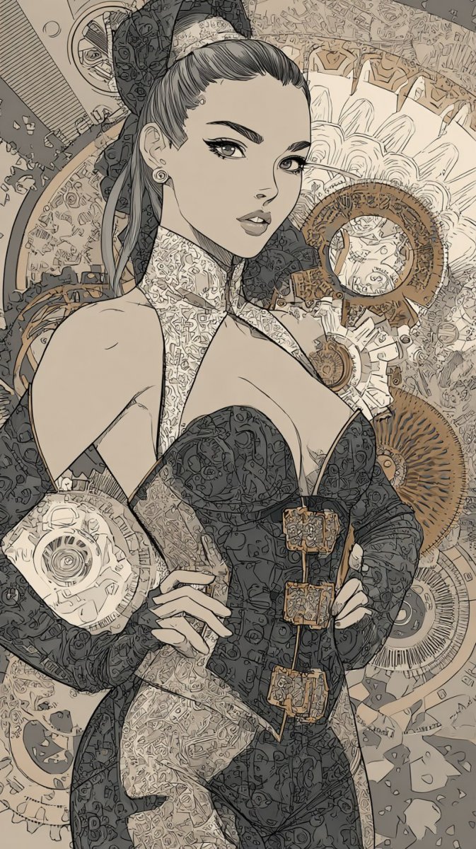 Завораживающая сюрреалистичная зарисовка чернилами представляет собой механическую женщину – футуристичную кибернетическую модницу. Иллюстрация поражает детализацией: сложное переплетение шестеренок, богатая текстура и тончайшие линии создают ощущение невероятной реалистичности. Монохромная палитра, вдохновленная гранж-артом, придает работе брутальный шарм и подчеркивает ее уникальность. Выражение лица модели – это смесь загадочности и силы, а прямой взгляд в глаза зрителю устанавливает глубокую эмоциональную связь. Качество изображения соответствует высоким стандартам ArtStation, демонстрируя мастерство художника. Динамичная и грациозная поза придает композиции легкость и элегантность, несмотря на механическую природу модели. Смелые линии и плавные формы подчеркивают футуристическую изысканность образа. Высокое разрешение 1024k позволяет рассмотреть мельчайшие детали этой впечатляющей работы, делая ее настоящим произведением искусства для ценителей современного цифрового рисунка и киберпанк-эстетики. Это не просто изображение – это окно в мир будущего, где технологии и мода сливаются воедино, создавая неповторимый и запоминающийся образ