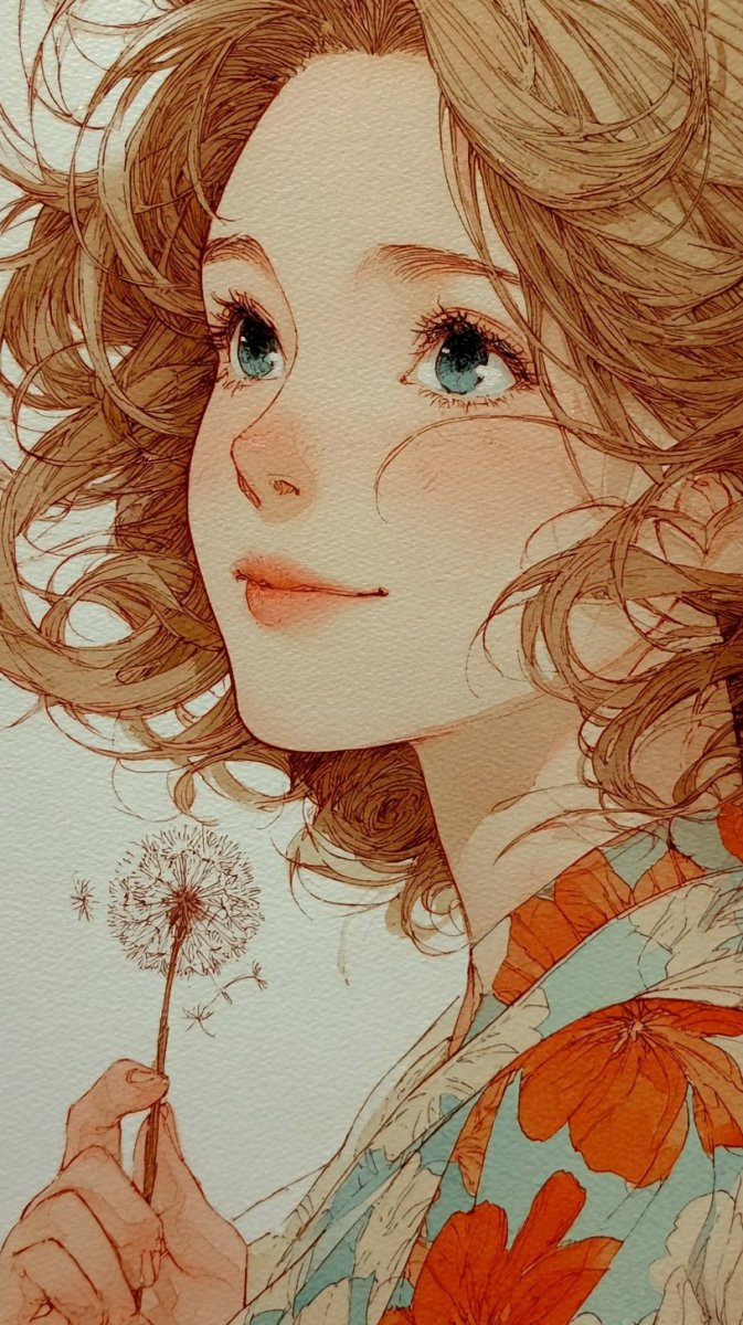 Sweet girl, Close-Up View, Eye-Level Angle Emphasizing Her Gentle Smile, Ink Drawing, Wearing a Flowing Pastel Dress with Floral Patterns, Radiating Warmth and Kindness, Gently Twirling a Dandelion in Her Hand, Set Against a Soft Sunrise Background with Light Pink and Orange Hues, Illuminated By Soft Morning Light Enhancing Her Innocent Glow, Crafted in a Shōjo drama Style, Evoking a Sense of Serene Beauty, Inspired by the Aesthetic of CLAMP, Detailed with Dreamy Features and Playful Ambiance, --s 750 --style raw.