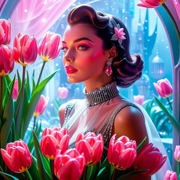 Техника исполнения включает элементы кюрбатова и маранэсов, что обеспечивает эффект мерцания и динамики. Пастельная цветовая гамма смягчает детали и создает атмосферу мечтательности и утонченности, подчеркивая грацию и хрупкость образа. В целом, работа вызывает ощущение волшебства и сказки, приглашая зрителя погрузиться в мир грез и фантазий, где царит прекрасная королева, олицетворяющая женственность и красоту. Использование нейросети позволило создать уникальное произведение искусства, сочетающее в себе элементы классической живописи и современных технологий.