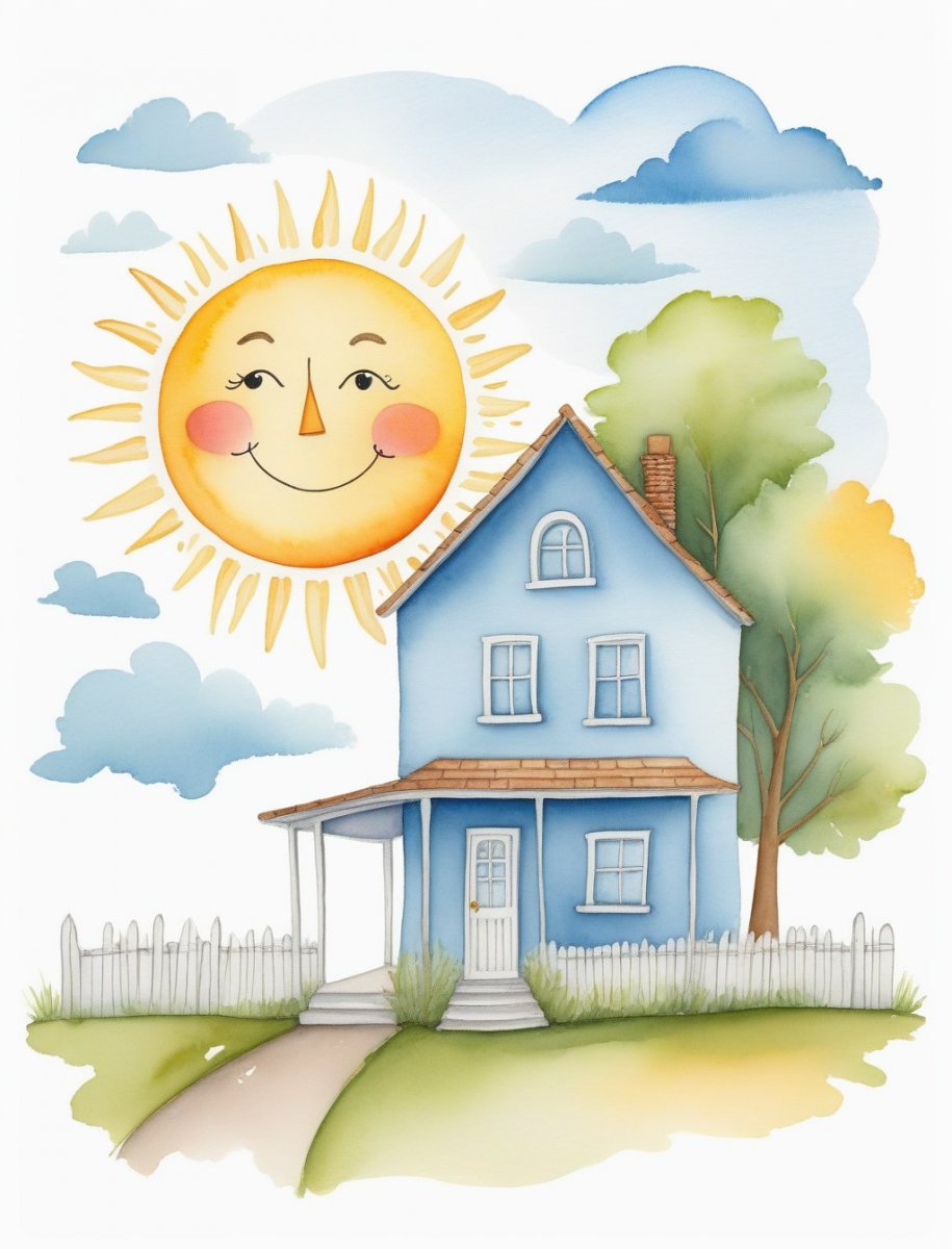 Нежная акварельная иллюстрация в духе детского рисунка излучает тепло и безмятежность. В центре композиции – улыбающееся солнце с округлым лицом, создающее ощущение радости и оптимизма. Простое голубое небо служит фоном для этой картины, на которой также изображен маленький домик с треугольной крышей и квадратными окнами, уютно расположившийся рядом с аккуратным забором из штакетника. Рядом растёт одинокое дерево с причудливым стволом и пышной кроной, добавляя пейзажу нотку живописности. Мягкие акварельные текстуры сочетаются с простыми карандашными контурами, а игривые небрежные мазки и детали в виде каракулей придают изображению наивный очарование, напоминающее о детской непосредственности. Плоская композиция на белом фоне и чистый эстетический стиль создают впечатление искреннего рисунка, выполненного цветными карандашами и оживлённого нежными цветовыми акцентами. Эта картина – воплощение простоты, тепла и беззаботности, способное вызвать ностальгию по детству и подарить ощущение уюта и спокойствия. Идеально подойдет для оформления детской комнаты или в качестве милого подарка близкому человеку, ценящему рукотворную красоту и искренние чувства. Это визуальное воплощение мечты о солнечном доме и счастливом детстве