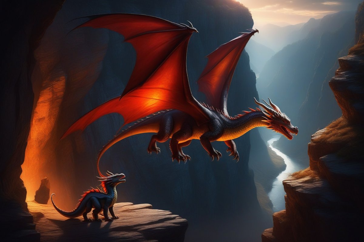 stable diffusion Красный дракон и детеныш: эпическая сцена в скале с мягким светом и глубокими тенями. Изображение из нейронной сети Stable Diffusion
