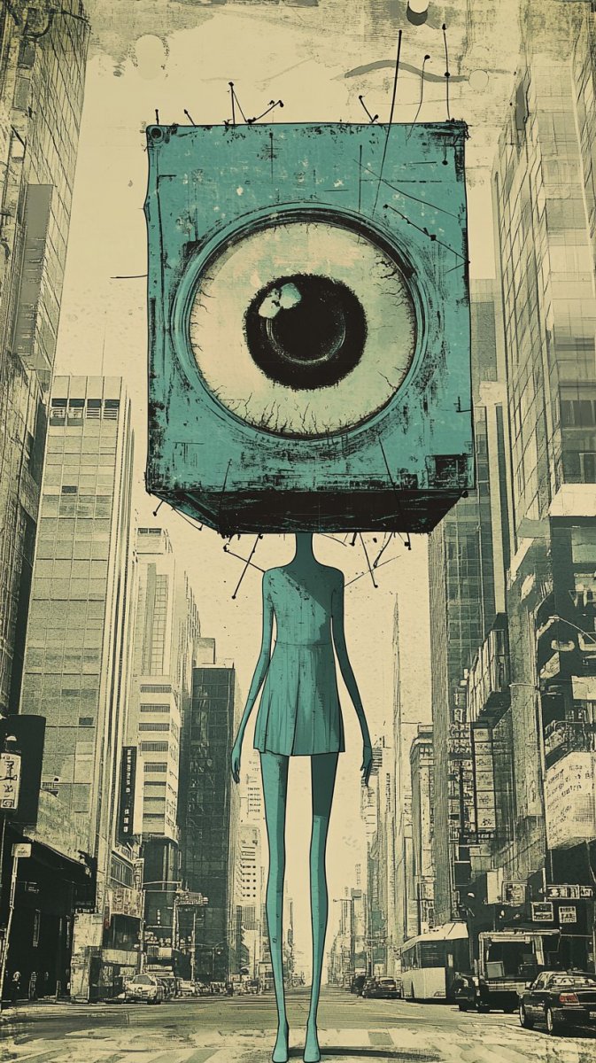 Сюрреалистичный кошмарный сон, сотканный из противоречий и тревоги. В центре этого визуального полотна – жутковательно милый одноглазый бумажный кубик на тощих ножках, управляющий кабриолетом по улице Графити Питайа. Этот странный персонаж, облаченный в колготки и украшенный огромным свадебным атласным бантом на голове, несет с собой небольшой чемоданчик, словно пряча тайну или уносясь от опасности. Фон картины представляет собой апокалиптический пейзаж: заброшенные небоскребы из сломанных проводов, обрывки плакатов и рекламные экраны, укутанные в фольгу. Все это пронизано духом пятидесятого первого века, выдержано в приглушенной кремово-серой гамме с наложением капель, создающих ощущение влажности и гниения. Одинокий красочный бирюзовый монокль-линза, увеличивающий единственный глаз, выражает неподдельную тревогу и страх, усиливая общее ощущение надвигающейся беды. В образе присутствуют элементы шелка, рентгеновских снимков и мозаики, подчеркивающие хрупкость и уязвимость персонажа на фоне всепоглощающего декаданса и разрушения. Это визуальная поэма о потерянности, одиночестве и обреченности в мире, где реальность переплетается с кошмарными фантазиями. Картина словно шепчет об утраченных надеждах и неизбежности упадка, оставляя зрителя с чувством глубокой меланхолии и дискомфорта
