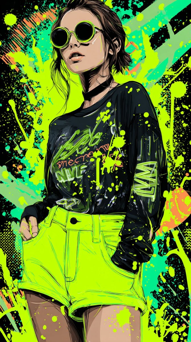 Яркий и динамичный дизайн футболки в стиле цифровой живописи, вдохновленный обложкой модного журнала. Композиция сочетает в себе энергичные брызги краски, контрастные элементы на темном фоне и графические акценты черных линий на неоново-лаймовом поле. Изображение пронизано любовью к деталям и выполнене в мультяшной манере, что придает ему современный и запоминающийся вид. Идеально подойдет для создания тематического обоев для iPhone, отражая ощущение живости и движения. В работе использованы насыщенные цвета и векторная графика для достижения максимальной четкости и визуального воздействия. Это не просто дизайн – это взрыв красок и эмоций, способный привлечь внимание и подчеркнуть индивидуальность владельца. Энергичная атмосфера рисунка заряжает позитивом и создает ощущение легкости и свободы. Сочетание темного фона и ярких акцентов придает изображению глубину и объем, делая его визуально привлекательным и запоминающимся. Дизайн передает ощущение спонтанности и творчества, словно запечатленный момент вдохновения. Этот образ станет отличным способом выразить свою индивидуальность и чувство стиля
