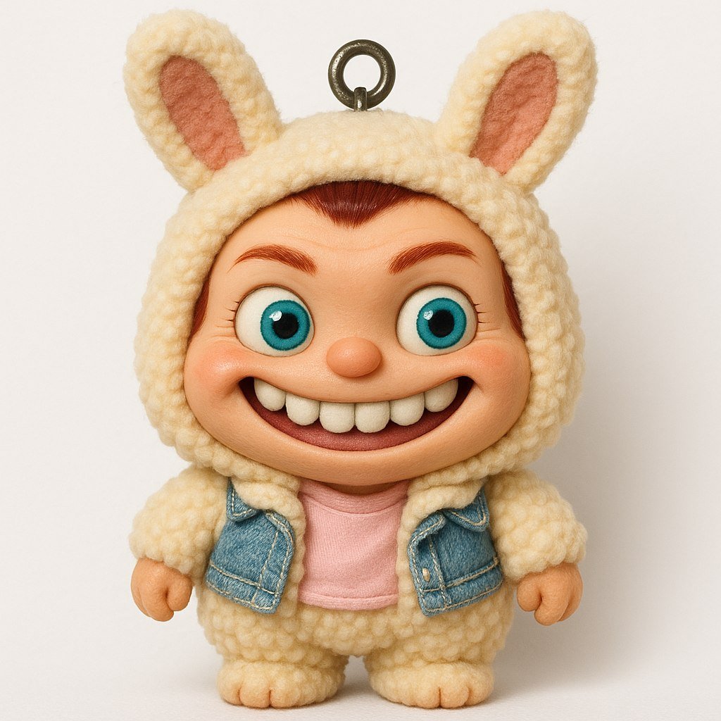 На основе фото создай узнаваемый мультяшный брелок-персонаж в стиле куклы Лабубу (ультрареализм). Персонаж с большой головой, крупными круглыми глазами, озорным выражением лица и широкой зубастой улыбкой. Одень его в пушистый кремовый комбинезон, имитирующий овечью шерсть, с капюшоном и большими стоячими кроличьими ушами с розово-коричневым акцентом. Лицо открыто. Маленькие ручки и голые стопы выглядывают из-под комбинезона. Персонаж стоит на белом фоне, похож на плюшевого монстрёнка в кроличьем костюме