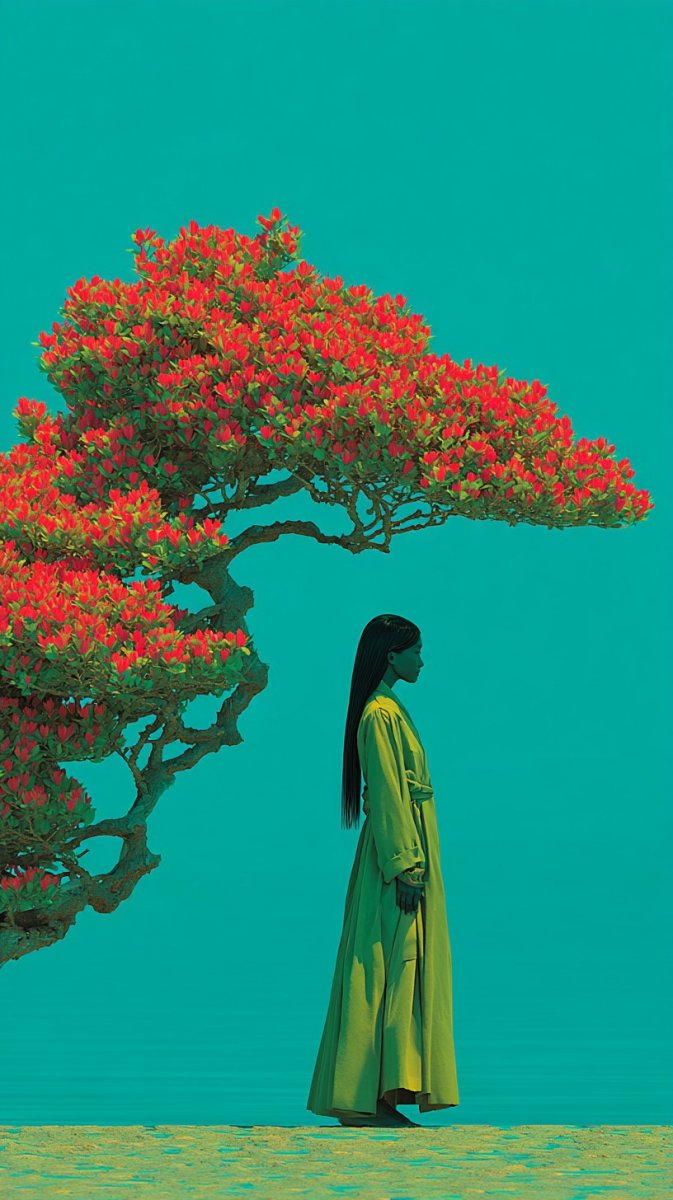 Завораживающий образ эфемерной женщины, парящей над землей в сказочном зеленом платье из листьев. Её длинные золотые челки и темные волосы создают контрастный акцент на фоне насыщенного красного цвета, окружающего её словно театральная декорация. Стилизованное под работы Тима Уокера фото воплощает собой сюрреалистическую красоту, где природа и мода сливаются воедино – ветви деревьев растут прямо из ног модели, создавая ощущение неземной связи с окружающим миром. В композиции присутствует изящный темно-синий бонсай, добавляющий элемент минимализма и подчеркивающий хрупкость момента. Пастельная цветовая гамма смягчает интенсивность фона, придавая изображению тонкий и утонченный шарм. Высотная мода представлена в полной мере благодаря тщательному подбору деталей и акценту на фигуре модели. Это не просто фотография – это визуальный рассказ о красоте, мистике и гармонии с природой, запечатленный в стиле высококачественной художественной фотографии. Каждое направление света и оттенок цвета создают ощущение волшебства и погружают зрителя в мир грез и фантазий. Изображение излучает спокойствие и умиротворение, несмотря на насыщенную композицию и яркие цвета, что делает его особенно привлекательным для ценителей искусства и моды