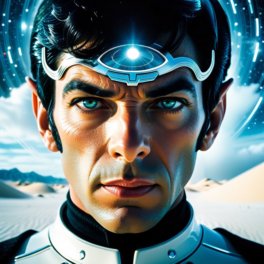 динамичное изображение, футуристика, звездный путь, Спок, живи и процветай, глаза, взгляд, эпично, мрачно, звуковые волны,акцент на детали, небо пустое, мрачное, зловещее скопление облаков, мистика, белый белый песок