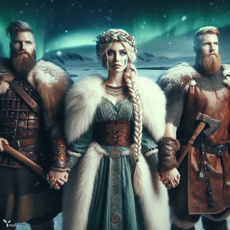 Могучая воительница викингов с длинной белой косой, облаченная в меховой плащ, украшенный рунами, гордо стоит рядом со своими верными спутниками – двумя воинами в кожаных доспехах, вооруженными топорами. Все трое уверенно смотрят прямо на зрителя, излучая силу и решимость. За их спиной простирается бескрайняя заснеженная тундра, освещенная завораживающим великолепием северного сияния. Небо переливается яркими оттенками белого, зеленого и голубого, создавая поистине мистическую и впечатляющую атмосферу. Картина выполнена в формате крупного плана, что позволяет детально рассмотреть лица персонажей, их выражение гордости и непоколебимого духа. Чувствуется мощь древних традиций, связь с природой и готовность к любым испытаниям. Это не просто изображение – это воплощение силы, храбрости и величия викингов, запечатленное в морозной красоте северных пейзажей. Взгляд этих трех воинов пронзителен и полон вызова, словно они приглашают зрителя разделить с ними их судьбу и окунуться в мир легенд и героических подвигов. Изображение передаёт ощущение сурового климата и несломленного духа народа викингов, живущего в гармонии с дикой природой и верящего в свою силу. Каждый элемент картины пронизан символизмом – руны на плаще воительницы, топоры в руках воинов, мерцающее северное сияние над головой