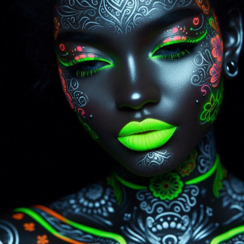 Завораживающая красота, сотканная из света и тени, воплощает собой дерзкий союз традиций и футуристического великолепия. Перед нами не просто девушка, а настоящее произведение искусства, где древние мотивы хохломы переплетаются с современным флуоресцентным шиком. Серебристый филигранный узор, словно живой, струится по коже, создавая ощущение невесомости и волшебства. Яркие неоновые оттенки на губах добавляют образу пикантности и энергии, а сложные татуировки становятся отражением глубоких эмоций и внутреннего мира. Вся композиция пронизана атмосферой крутого шика и яркой неоновой эстетики, создавая ощущение погружения в параллельную реальность, где красота не знает границ и правила существуют лишь для того, чтобы их нарушать. Это визуальный гимн индивидуальности и самовыражению, вызывающий бурю чувств и оставляющий неизгладимое впечатление. Каждая деталь, от блеска серебра до насыщенности неоновых цветов, работает на создание неповторимого образа, который невозможно забыть. Это симфония света и цвета, воплощенная в человеческой форме, где каждый штрих несет в себе глубокий смысл и эстетическое наслаждение. Она словно сошла с полотна художника-авангардиста, сочетая в себе утонченность классики и дерзость современности