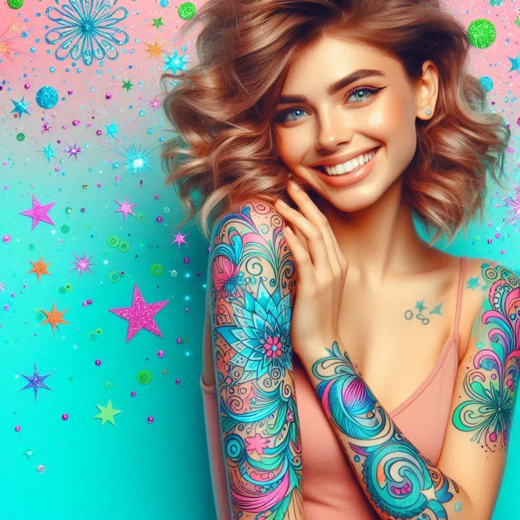 bubbly babe with bright cyan filigree tattoos showcasing a cheerful vibe, surrounded by colorful sparkles and vibrant patterns, her hair styled in playful waves against a bright pastel background.