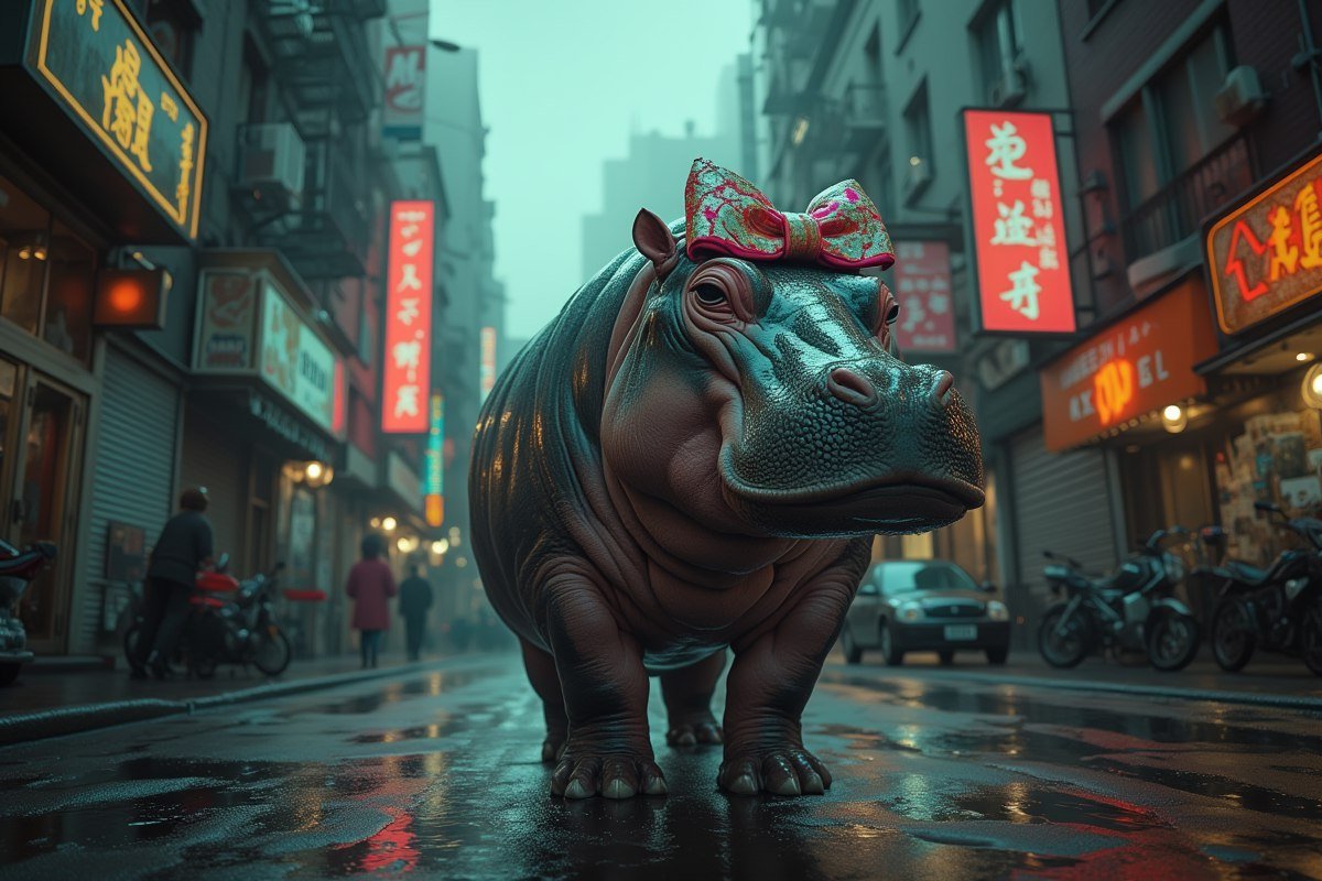 A vibrant hippopotamus with a glamorous bow on its head on a gray, gloomy street, dark urban fantasy, cinematic lighting, dramatic shadows, rain-slicked pavement reflecting neon signs, hyperrealistic textures, detailed fur and skin, bokeh effect in background lights, wide-angle lens perspective, moody atmosphere, sense of isolation, surreal juxtaposition of creature and environment, film grain texture, high contrast color palette, desaturated tones with pops of vibrant color from the bow, volumetric lighting, depth of field, intricate details on buildings, subtle motion blur, cinematic composition, art by Greg Rutkowski and Syd Mead, 8k resol...