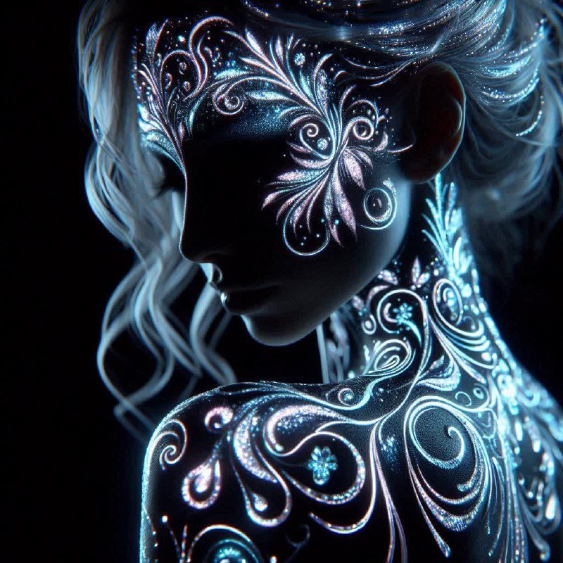 Восхитительный образ современной богини, сотканный из света и тени, завораживает своей неземной красотой. Изящный силуэт девушки становится холстом для пленительных неоновых татуировок, выполненных в серебристой гамме. Они словно оживают, пульсируя яркими красками и создавая глубокий эмоциональный отклик у зрителя. Узоры напоминают текущее серебро, филигранную работу искусного мастера, где каждая линия продумана до мелочей. Стиль киаратоскуро подчеркивает драматизм композиции, усиливая контраст между светом и тенью, создавая ощущение таинственности и притягательности. Каждое изображение – это взрыв цвета и света, запечатленный в цифровом формате с потрясающей детализацией благодаря технологии CGI и разрешению 1024k. Это не просто визуальное произведение искусства, а захватывающий портал в мир фантазий и грёз, где реальность переплетается с вымыслом. Искрящиеся неоновые узоры проникают под кожу, оставляя неизгладимое впечатление и пробуждая бурю эмоций. Образ излучает силу, уверенность и неповторимую элегантность. Это символ современной женственности, сочетающей в себе хрупкость и мощь, красоту и загадку