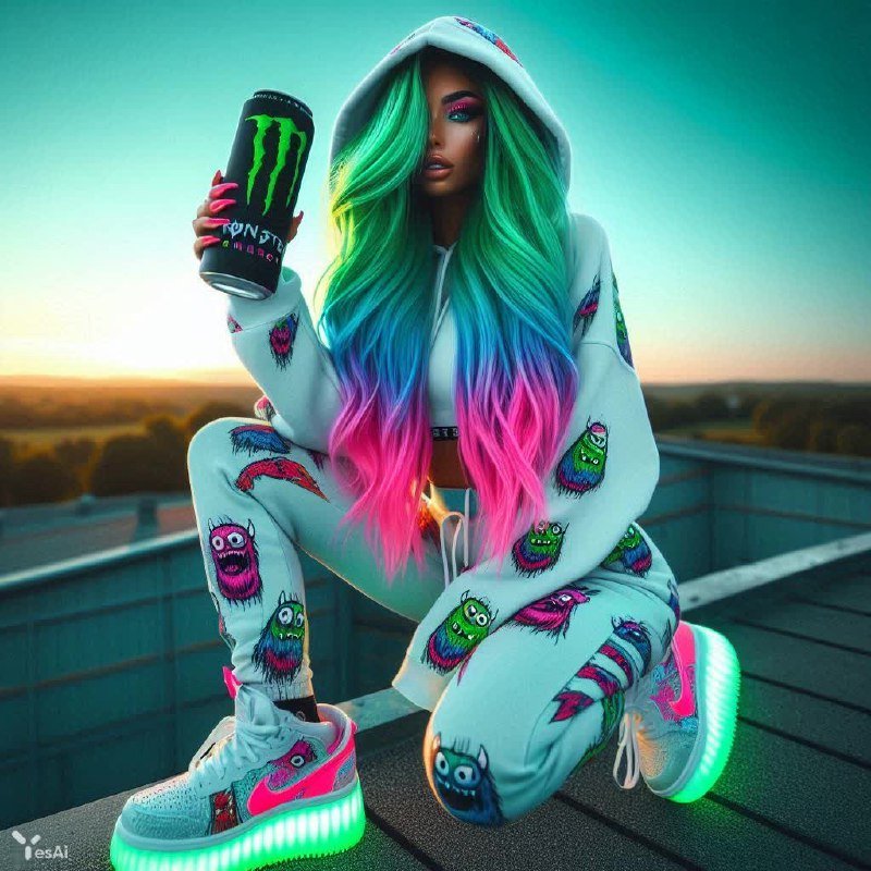 Завораживающий анаглиф эффект оживает в этой фотографии, демонстрируя пленительную красоту девушки, словно сотканной из глинча и опалового свечения. Она – воплощение стиля и грации, сидящая на корточках в ультрамодных белых кроссовках на платформе. Длинные волосы с ярким градиентом от светлого у корней до розового и синего на кончиках создают неповторимый образ. Девушка одета в стильный спортивный комплект: худи, спортивные штаны, украшенные красочными рисунками монстров и ремнями с клёпками, а также короткий топ с броским логотипом MФNSTER Energy. В руках она держит чёрную банку любимого напитка с трубочкой. Нежный зелёный закат служит волшебным фоном для этой яркой сцены. Акцент на безупречном макияже и длинных ресницах подчеркивает её завораживающую красоту и добавляет образу нотку загадочности. Эта фотография – настоящий гимн современной моде, креативности и энергии, передающий атмосферу динамизма и безграничного вдохновения. Она захватывает взгляд своей необычностью и оставляем ощущение лёгкости и волшебства