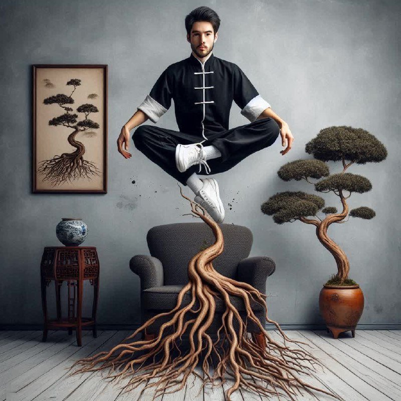 Завораживающий сюрреалистический портрет молодого человека, словно сошедший с полотен Дали и вдохновленный эстетикой китайского искусства. На фотографии запечатлен момент неожиданного прыжка – юноша в черной блузе и белой футболке с кроссовками парит над старинным креслом, сидящим на полу по-восточному. Самое необычное - из его ног прорастают мощные корни дерева, символизирующие связь с природой, укорененность в земле и одновременно стремление к свободе и полету. Композиция выполнена в причудливой манере, сочетая европейскую художественную традицию и восточную философию. Игра света и тени подчеркивает драматизм сцены, а детализированная проработка корней создает ощущение реальности происходящего, несмотря на всю фантасмагоричность образа. Это не просто фотография – это визуальная метафора о внутреннем мире человека, его поисках идентичности и гармонии с окружающим миром. Смелое сочетание стилей, мастерское владение техникой и глубокий символизм делают этот снимок уникальным произведением искусства, способным вызвать бурю эмоций и заставить задуматься о вечных вопросах бытия. Фотография передает атмосферу загадочности и непредсказуемости, приглашая зрителя в мир сновидений и фантазий