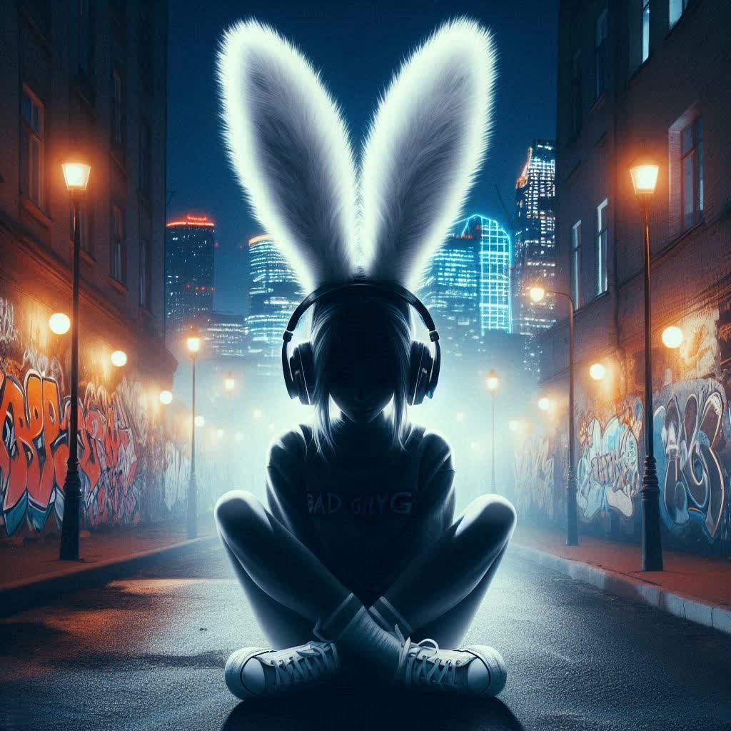 Завораживающая двойная экспозиция переплетает реальность и фантазию в сюрреалистичном образе девушки, скрытой в тенях ночного города. Атмосфера тайны и игривости создается благодаря контрасту света и тени, подчеркнутому ярким граффити с надписью 'Bad Girl' на фоне глубокого черного цвета. Неожиданный элемент – пушистые заячьи ушки, добавляющий образу некую сказочность и наивность, что гармонично сочетается с современными белыми кроссовками Berdsa. Акцент на длинных ресницах придает взгляду выразительность и загадочность, а ультравысокая детализация в формате 1024K раскрывает каждую грань этого цифрового шедевра. Использование CGI позволяет создать невероятно реалистичный и эффектный образ, погружающий зрителя в мир, где границы между сном и явью стираются. Картина словно дышит энергией ночного города, его тайнами и скрытыми историями, воплощенными в образе загадочной девушки, сливающейся с тенями на Парковке под звуки музыки из наушников. Это визуальное исследование темности и света, игривости и соблазна, созданное с использованием передовых технологий цифрового искусства