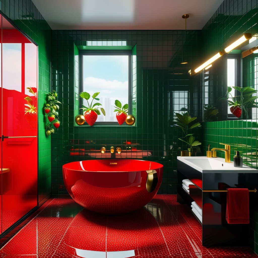 огромная современная ванная комната с черно-золотой кафельной мраморной плиткой и красной раковиной,прозрачный унитаз в виде ягоды-клубники с реалистичной обьемной текстурой и клубничным цветом с зелёным пестиком, высоко детализированный рендеринг,освещение мягкое,теплый отблеск на плитку,