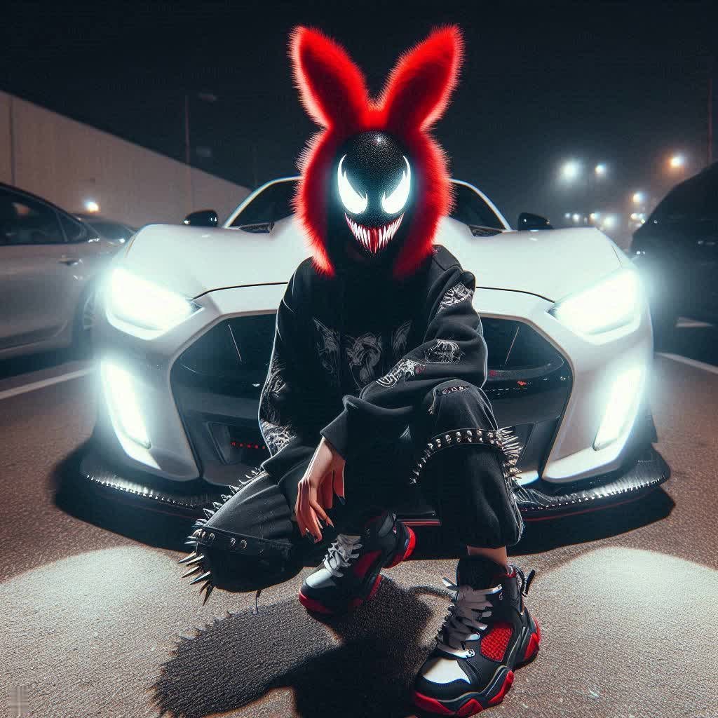 Digital photo art. Night in a parking lot, headlights of a sports car shining white lumen light, angle straight at the camera, faceless figure of a gangsta girl with a black matte plastic venom mask on her face, red fluffy rabbit ears, dynamic pose, wearing a fluffy black and red sweatshirt. Wide cargo pants with spikes and studs, high-top sneakers with laces, HIP-HOP style, play of shadows and light, surreal, full HD quality. cgi, 1024K