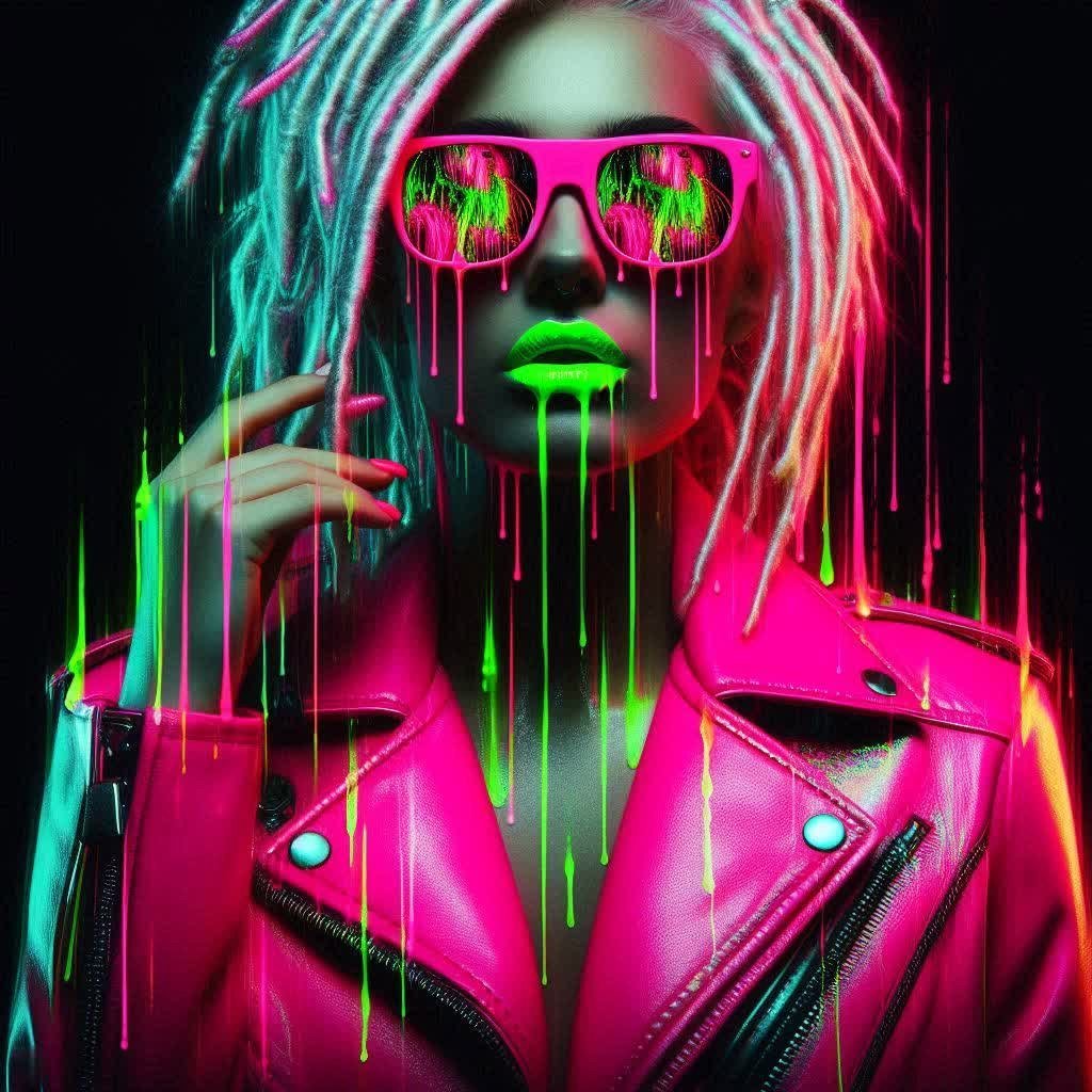 Double exposure, gangsta girl, a bright pink neon leather jacket with a fitted silhouette, featuring drops of neon lime and pink ultraviolet paint in a bold glitch style. Huge neon pink sunglasses with neon lime green lenses, from which dripping neon fluorescent opalescence paint flows. Platinum blonde dreadlocks gathered in a high, messy hairstyle with streams of neon pink and neon lime paint. Dramatic neon lime lipstick on the lips, bright neon lighting, contrasting black background in neon graphic style. cgi, 1024K