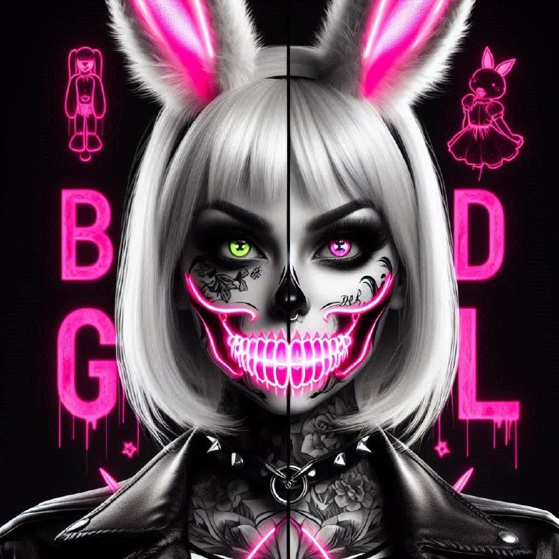 Double Exposure, Poster, Energy suit, Horror Demones, Neon Pink Acid Lime, Details the word inscription "Bad Girl", very beautiful Woman in purely black top and white shorts, steep hips, large eyes of the oenkee of Gothic, Corn Lips, Fluffy Bunny with bright гжель tattoos, black matte background, cgi, 1024K