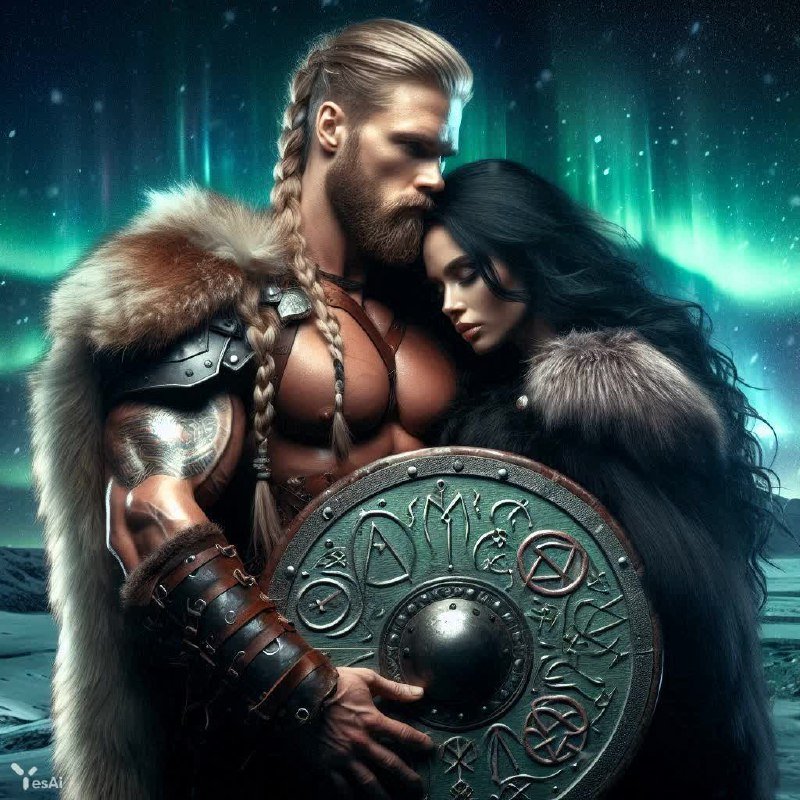 В объятиях силы и любви запечатлён момент нежности на фоне северного сияния. Могучий воин с длинной светлой косой, облачённый в кожаную и меховую броню, украшенную руническими знаками на щите, страстно прижимает к себе прекрасную женщину с вороными волосами, закутанную в роскошный мех. Их взгляды горят любовью и решимостью, обращённые прямо на зрителя. Вокруг них танцуют мерцающие снежинки и переливаются яркие огни северного неба – изумрудные, лазурные и белоснежные оттенки создают волшебную атмосферу. Близкий план позволяет рассмотреть каждую деталь: рельеф мускулов воина, мягкость меха на одежде женщины, замысловатые руны на щите и, конечно же, глубину чувств, читающуюся в их глазах. Эта картина – гимн любви, стойкости и красоте дикой природы, наполненный мистической энергией древних символов. В ней сплелись элементы сказочной легенды и реалистичного изображения, создавая поистине завораживающий образ двух любящих сердец, защищающих друг друга в суровом мире северных просторов. Это история о мужестве и нежности, о страсти и преданности, рассказанная языком света и тени на фоне вечного льда и небесного великолепия