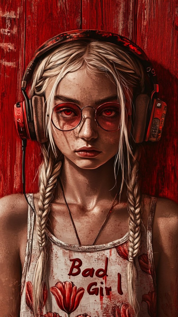 Double Exposition, Lush Yummy E-Girl with piercing red eyes, neon ultraviolet glare, Platinum Blonde braids, stylish headphones, Energy suit with tulips print and expressive large Pixar eyes, Surrealism, Body proportions, detailed painting on wood, black top and white shorts, sparkling manicure, graffiti inscription "Bad Girl" --s 750 --style raw --w 10