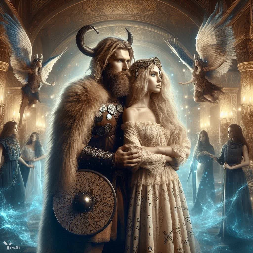 В величественном зале Вальхаллы разворачивается сцена, пропитанная мистикой и древней силой. Могучий викинг с длинной светлой бородой, облаченный в роскошный меховой плащ, украшенный руническими символами, нежно обнимает прекрасную женщину с длинными золотистыми волосами. Её лёгкое платье искусно украшено языческими узорами, свидетельствуя о её связи с древними богами и традициями. Пара смотрит на зрителя с гордостью и уверенностью, словно приветствуя его в этом небесном обиталище героев. Вокруг них парят валькирии – воительницы-ангелы с сияющими крыльями, символизирующие божественную защиту и славу. Золотой зал, наполненный древней языческой магией, служит фоном для этой трогательной сцены, отражая величие и красоту мира богов. Яркие золотые, белоснежные и небесно-голубые тона создают атмосферу благодати и величия, подчеркивая мистическую природу происходящего. Детализированный крупный план позволяет зрителю ощутить близость к героям и полностью погрузиться в эту захватывающую дух картину, где переплетаются любовь, сила, вера и божественное присутствие. Это гимн древним традициям и бессмертной славе воинов, достигших Вальхаллы. Сцена пронизана ощущением умиротворения и одновременно – неукротимой мощи, что характерно для мира скандинавской мифологии