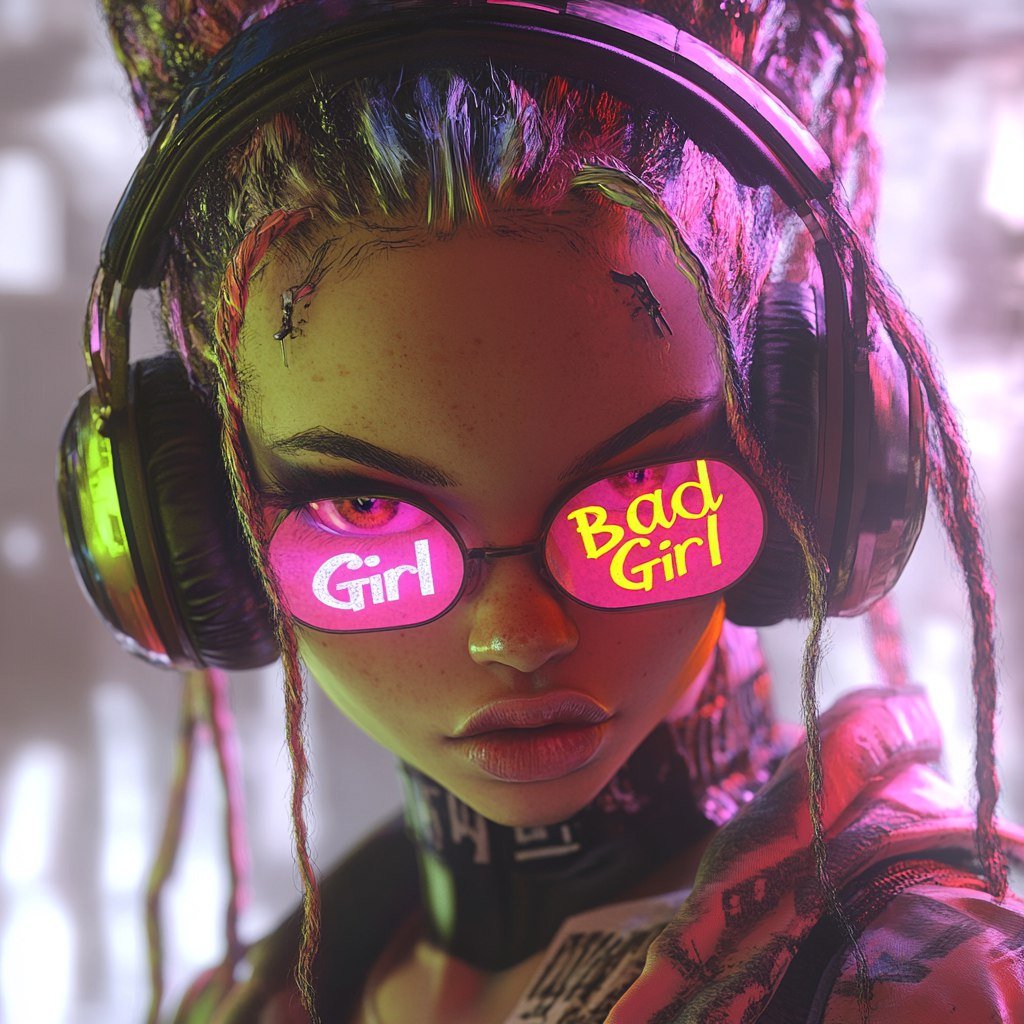 Double exposition, Energy suit with expressive large Pixar eyes Very beautiful gangsta-demones in steep headphones, Shocking Pink neon and Neon Orange drip effect on white dreadlocks, braids, real photos, details of Acid Lime, Details Details the word inscription "Bad Girl", HDR, binary code, platinum Blonde, glitter Multi-colored Opalescent Irization.