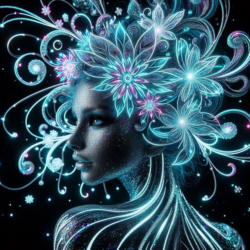 glitter girl с яркими циановыми татуировками из светящегося мерцающего серебра, в стиле чароскуро, вызывающие глубокие эмоции через яркие неоновые зентагли и абстрактные неоновые композиции, фотореалистичный блеск, сложные неоновые флористические узоры, сверкающее излучение изысканных деталей, контраст с тёмным фоном, игривый характер, cgi, 1024k