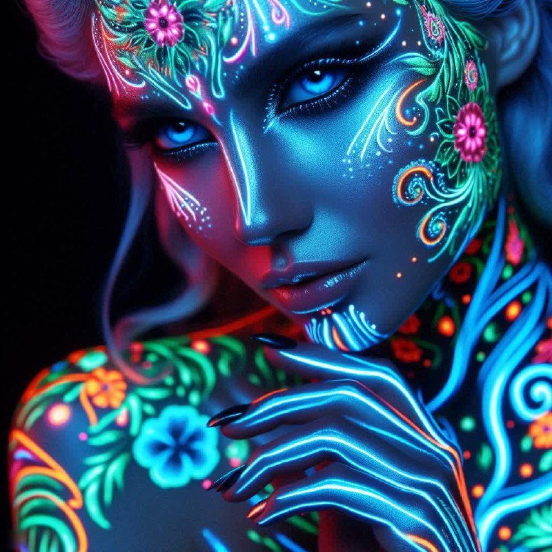 babe с яркими светящимися татуировками в стиле гжель, как жидкая филигранная ртуть, на лице - выразительное лицо, фотореалистичное искусство неоновых рисунков на теле, яркий эмоциональный диапазон, сложные неоновые флористические узоры и радиоактивное серебро, девичий шарм в ярких неоновых тонах, cgi, 1024k