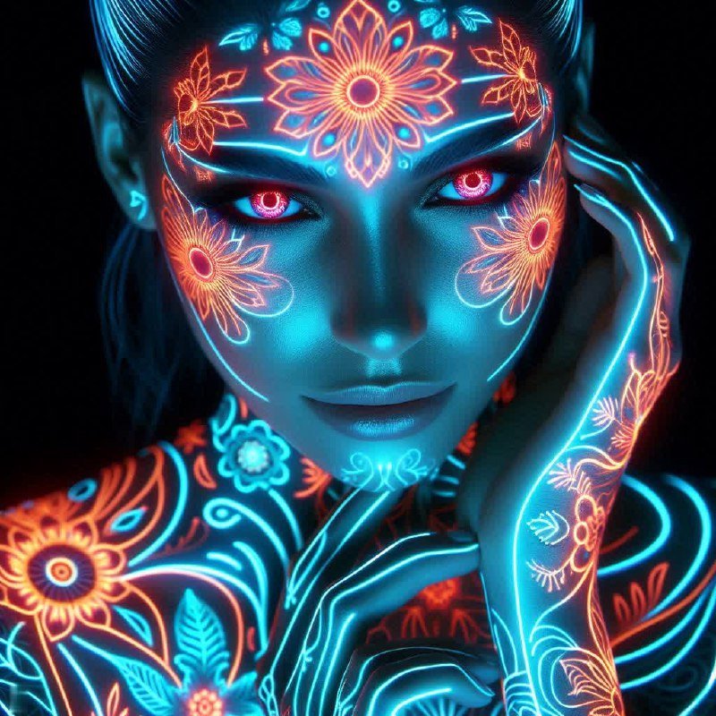 Завораживающая картина, где сияющая девушка предстает воплощением футуристической красоты и таинственной силы. Ее кожа словно излучает внутренний свет, а изящные неоновые татуировки, напоминающие мерцающую ртуть, создают ощущение нереальности и гипнотического очарования. Сложные флористические узоры, выполненные в ярких неоновых тонах, переплетаются с ее телом, подчеркивая грацию и хрупкость образа. Фотореалистичная детализация передает каждый оттенок света и тени, усиливая эффект присутствия и погружая зрителя в мир фантазий. Стиль чароскуро добавляет глубины и драматизма композиции, создавая контраст между сияющей фигурой девушки и темным фоном, что позволяет максимально выделить ее красоту и выразительность. Взгляд девушки пронзителен и полон глубоких эмоций, отражая внутренний мир, полный загадок и тайн. Это не просто портрет – это поэтическое размышление о красоте, технологиях и человеческой душе, запечатленное в ярких неоновых красках и мастерски выполненной детализации. Вся картина пронизана ощущением мистического сияния и неизведанных возможностей. Она словно приглашает зрителя окунуться в мир грез и фантазий, где реальность переплетается с искусством, а красота становится источником вдохновения