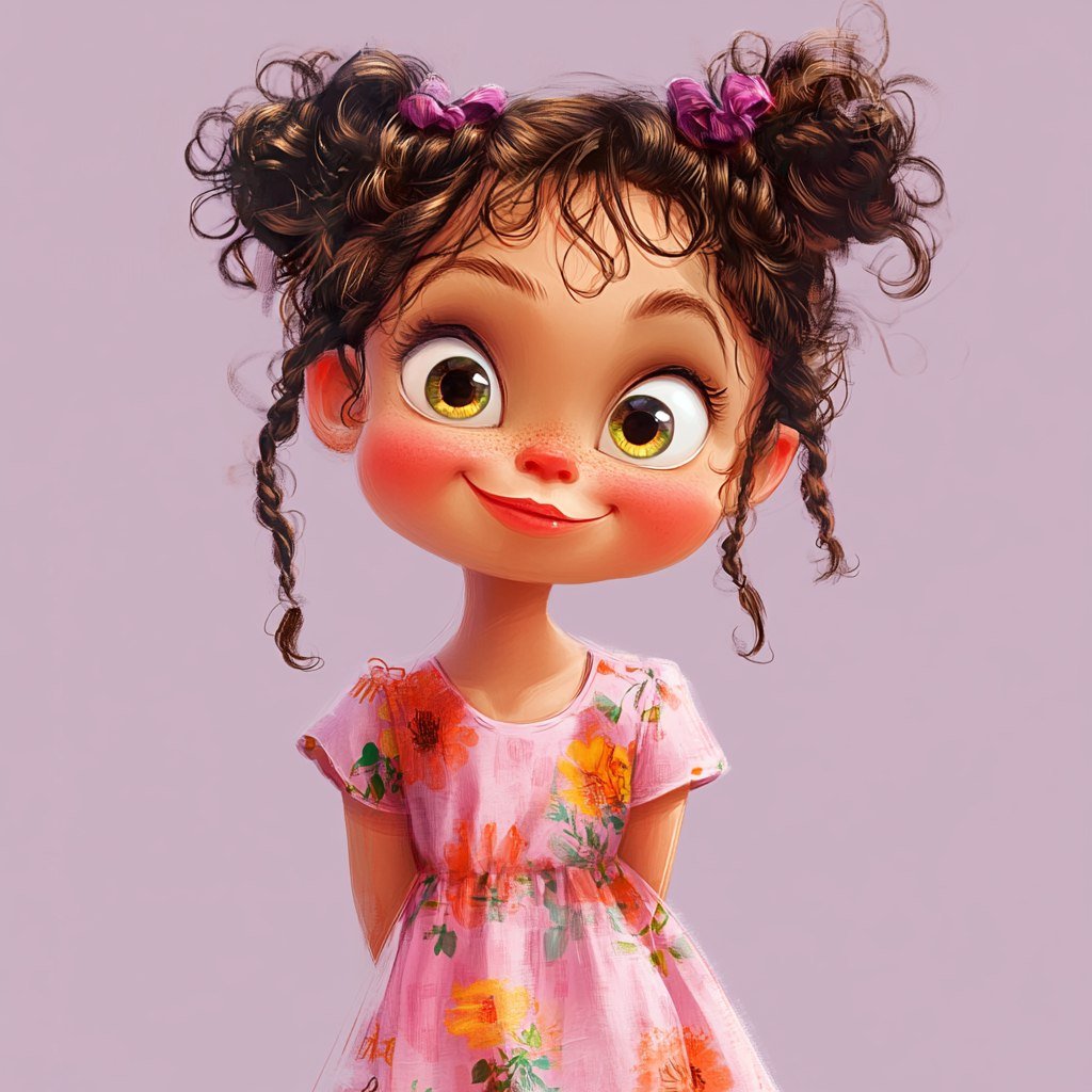 Забавный мультяшный персонаж с кудрявыми косичками очаровывает своей непосредственностью и энергией. Яркий розовый наряд выделяется на фоне однотонного светло-лилового фона создавая атмосферу легкости и беззаботности. Гипертрофированные черты лица придают образу комичность и гротескность подчеркивая его примитивный стиль. Поза полна экспрессии и радости передающей жизнерадостный характер героини. Визуальный язык мультфильма использует насыщенные цвета и игривые карикатурные выражения лиц чтобы создать запоминающийся и привлекательный образ. Это настоящий праздник для глаз сочетающий в себе наивность детского рисунка и дерзость экспрессионистской манеры исполнения. Персонаж излучает оптимизм и позитив обещая зрителям море веселья и хорошего настроения. Его уникальный внешний вид и неповторимый стиль делают его узнаваемым и любимым среди поклонников анимации. Каждая деталь изображения тщательно продумана чтобы передать всю гамму эмоций и чувств которые испытывает этот жизнерадостный персонаж. Это настоящий шедевр анимационного искусства который завораживает своей простотой и искренностью
