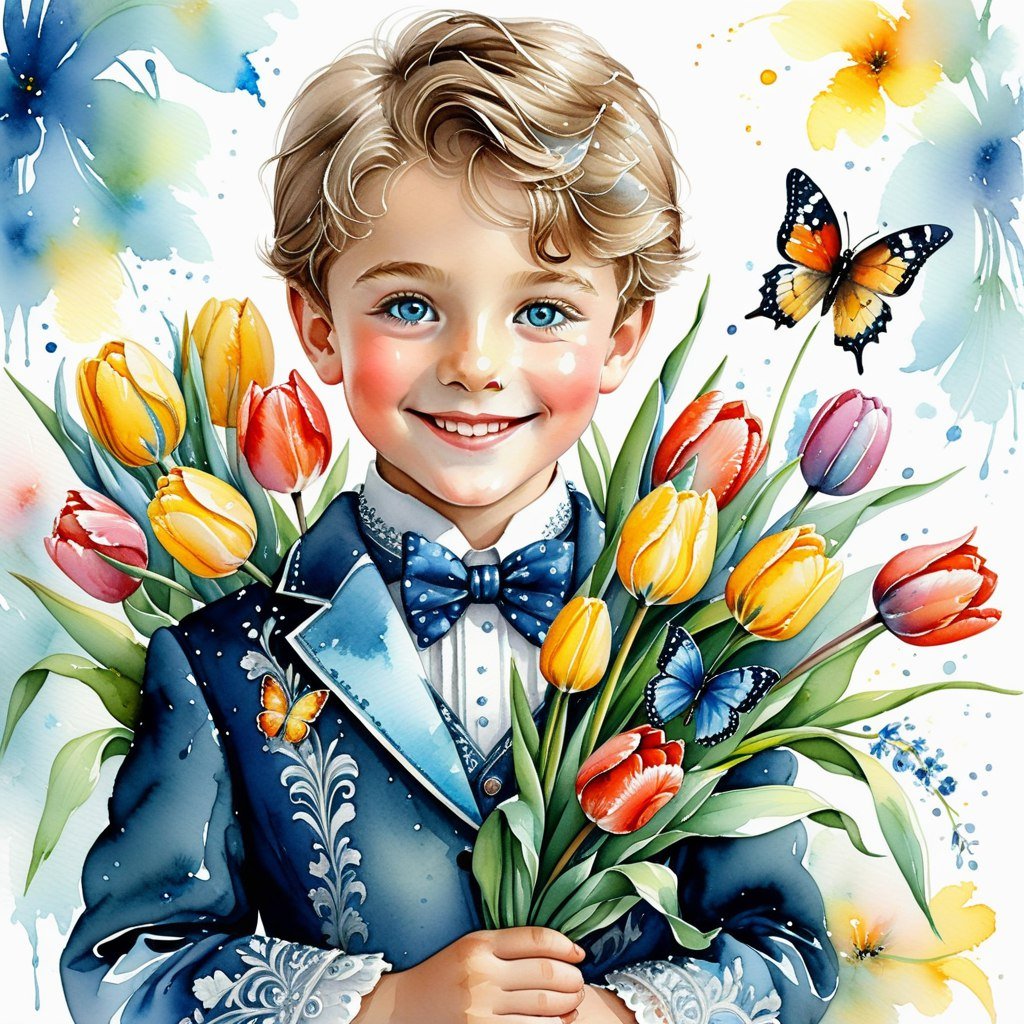 Очаровательный мальчик лет восьми с огромными серыми голубыми глазами излучает радость и улыбается, держа в руках роскошный букет тюльпанов. Его нарядный костюм подчёркивает элегантность образа, а бабочка на шее добавляет шарма. Изображение выполнено в технике влажной акварели с использованием четких линий туши, что придает работе особую изысканность и глубину. Яркие переливающиеся цвета создают ощущение волшебства и сказки, а филигранная проработка деталей свидетельствует о высоком качестве фотографии, выполненной в стиле рококо профессионалами. Это произведение искусства сочетает в себе наивную детскую непосредственность и изысканность классического стиля. Кажется, будто время остановилось, чтобы запечатлеть этот момент умиления и красоты. Взгляд мальчика полон нежности и искренности, а букет тюльпанов символизирует весну, надежду и новые начинания. Композиция тщательно продумана, каждый элемент играет свою роль в создании гармоничного и запоминающегося образа. Это настоящее произведение искусства, которое способно тронуть сердца зрителей своей красотой и очарованием. Фотография излучает свет и позитив, даря ощущение тепла и уюта