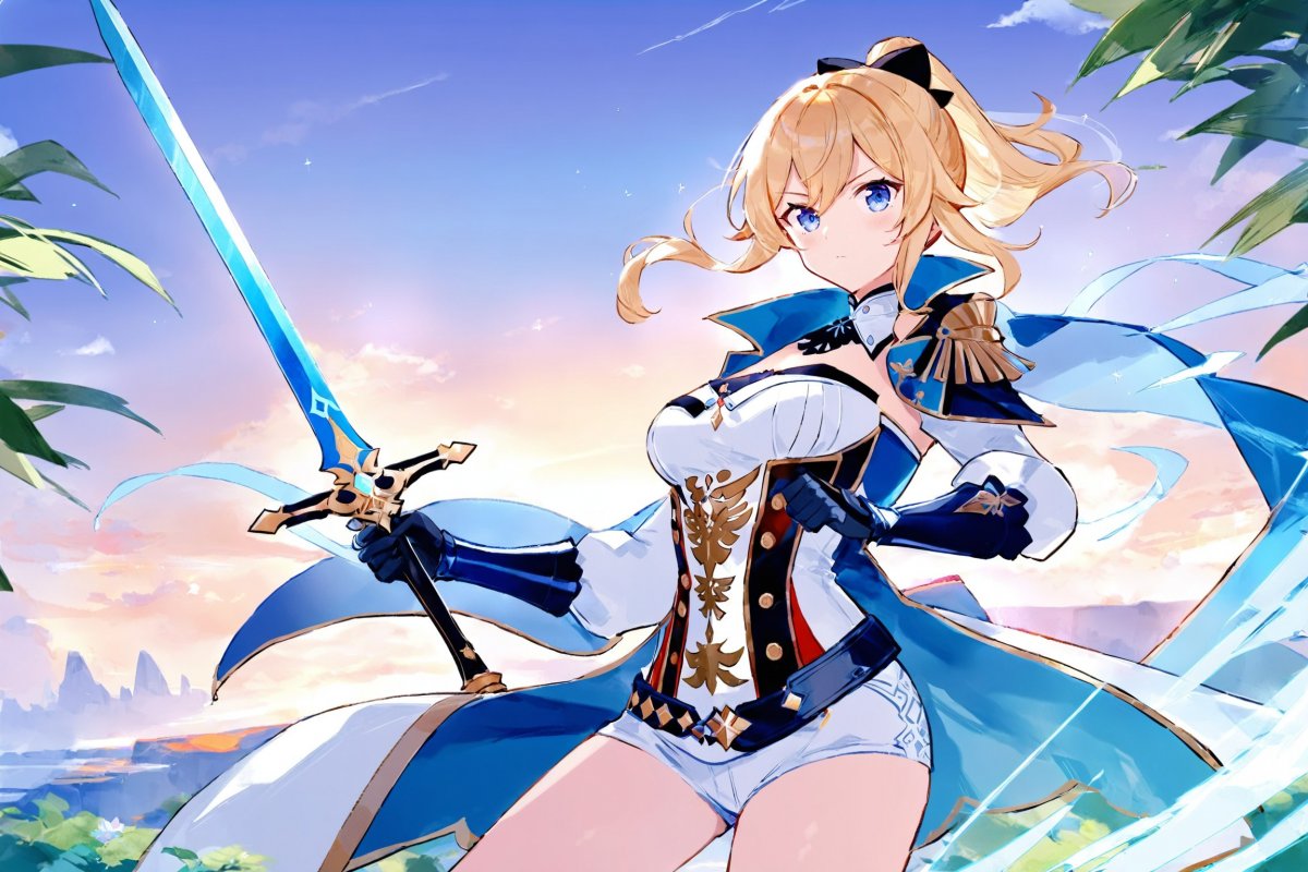 1girl, (jean \(genshin impact\): 1.1), genshin impact, (mola mola: 1.15), fuzichoco, ciloranko, migolu, ask \(askzy\), maccha \(mochancc\), solo, Wearing a Knight's Outfit, Long Blonde Hair, Holding a Sword, Determined Expression, Standing on a Cliff Overlooking the Sunset, Wind Flowing Through Her Hair, Detailed Armor Design, Blue and White Color Scheme, Background of Lush Greenery, Radiant Sky, A Sense of Adventure, Heroic Stance, Eye-Catching Accessories, Dynamic Pose, Masterpiece, Newest, Sensitive.