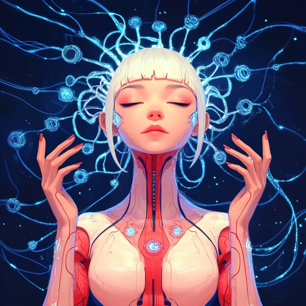 Загадочная кибер-волшебница предстает перед зрителем в окружении мерцающих рун силы. Ее металлическая кожа отражает окружающие огни, создавая завораживающий эффект игры света и тени. Серебряная и синяя броня не только подчеркивает ее силуэт, но и усиливает ее мистические способности, делая ее еще более грозной. На лице колдуньи играет хитрый оскал, выдающий уверенность в себе и владение могуществом. Этот образ сочетает в себе холодную красоту кибернетики и таинственную энергию магии, создавая неповторимый визуальный контраст. Взгляд персонажа полон загадок и намекает на скрытые мотивы. Она словно воплощение технологического прогресса, переплетенного с древними знаниями и магическими практиками. Изображение передает атмосферу силы, уверенности и таинственности, заставляя зрителя задуматься о природе ее способностей и цели. Детализация брони и рун подчеркивает мастерство исполнения, а игра света на металлической коже создает эффект объемности и реалистичности. Кибер-волшебница – это символ новой эры, где технологии и магия сливаются воедино, создавая нечто совершенно новое и захватывающее. Ее уверенный взгляд и хитрый оскал говорят о том, что она готова к любым испытаниям, используя как свои кибернетические улучшения, так и магические силы