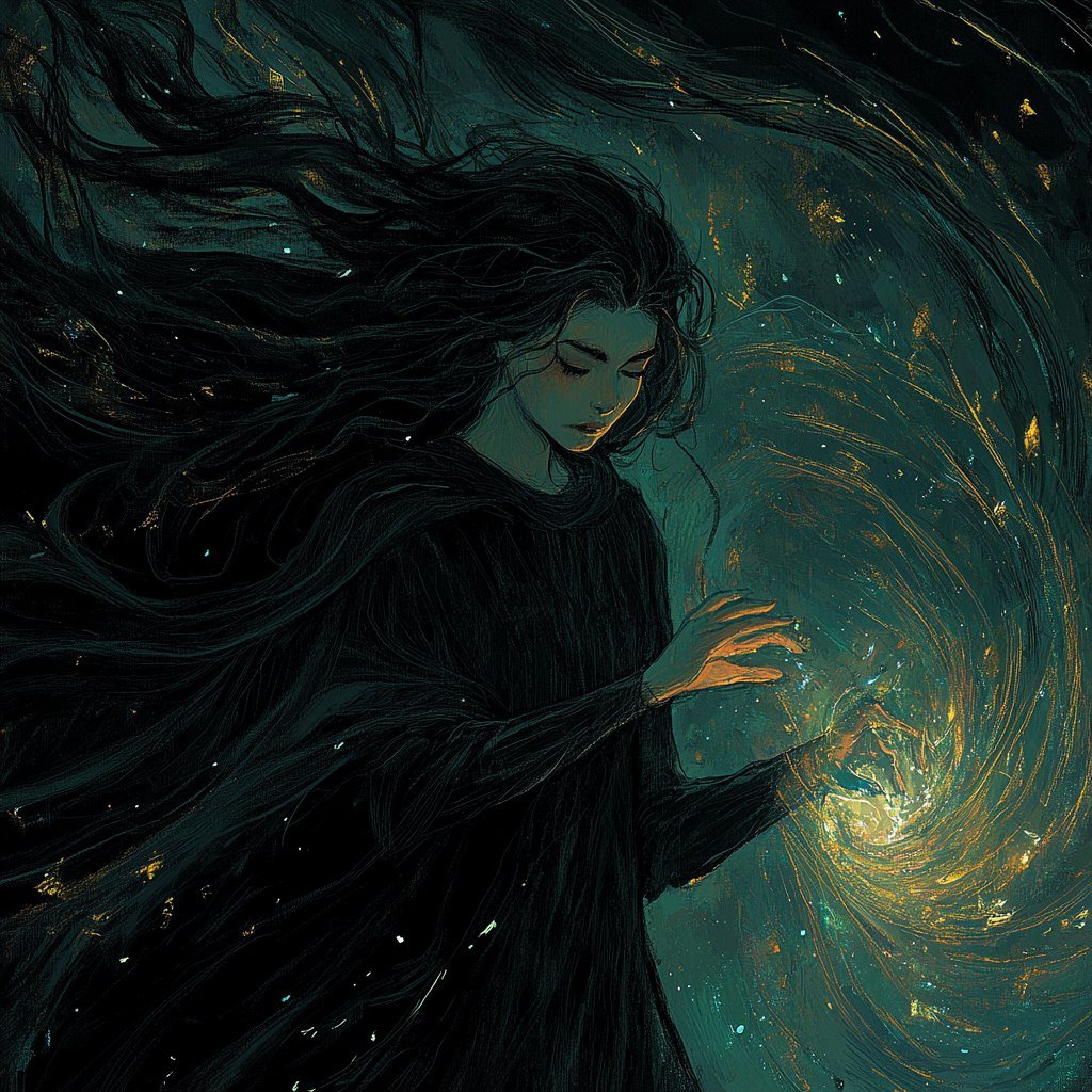 Могущественная ведьма-элементалистка, застывшая в эпицентре бушующего вихря стихий. Ее темное одеяние трепещет на ветру, а глаза искрятся смесью иронии и несгибаемой решимости. Она колдует, сплетая магию своими руками, создавая сложные заклинания из чистой энергии. Вокруг нее роятся пузыри, наполненные первозданной силой, готовые вырваться наружу в ослепительном потоке. В ее выражении лица читается как безудержная радость от могущества, так и серьезность цели, которую она преследует. Эта иллюстрация захватывает момент создания – пик магической трансформации, когда хаос стихий подчиняется воле ведьмы. Ее образ воплощает собой силу, мудрость и непредсказуемость природы, демонстрируя мастерство владения элементами и непоколебимую уверенность в своих способностях. Она словно повелительница бури, готовая обрушить на врагов всю мощь стихий или защитить тех, кто нуждается в ее помощи. Вся сцена пронизана динамикой и энергией, создавая ощущение непрерывного движения и магического напряжения. Взгляд ведьмы притягивает внимание, заставляя задуматься о тайнах магии и силе воли, способной управлять самой природой. Это не просто изображение – это окно в мир фантазий и невероятных возможностей